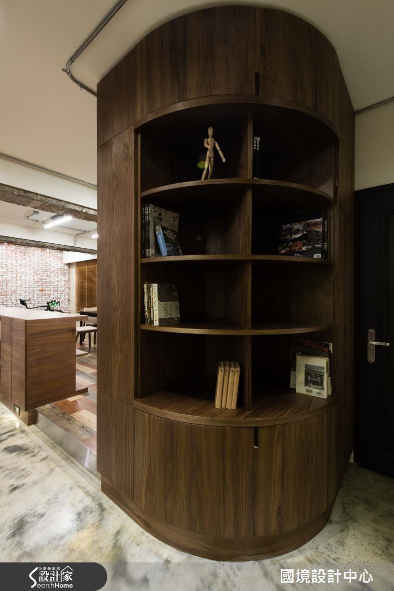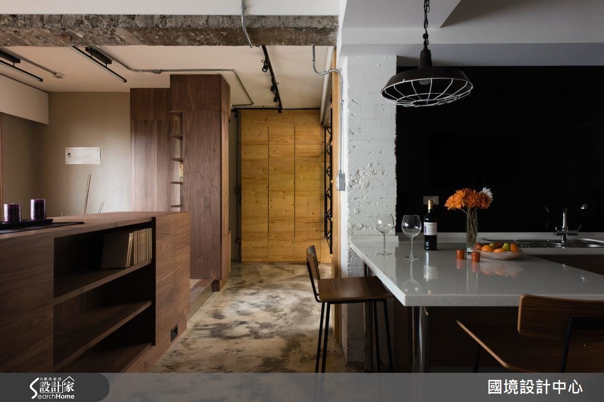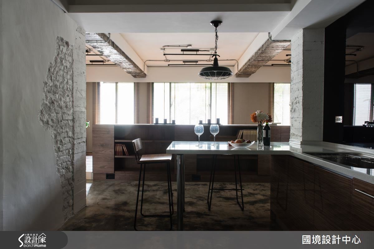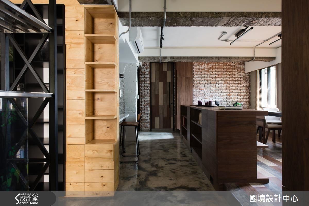 入門以大型圓弧櫃體拓增收納量度,並成為客廳通往其他空間的動線緩衝。利用鐵件與彩繪玻璃架起一道兼具置物機能的懸空屏隔,同時抹除穿堂煞疑慮。電視牆以大面積鋼刷木皮結合造型開放置物機能,搭配色調單純的家具,強調工業風格的純粹原味。保留原始天花高度,以粗獷的水泥樑面以及地坪材質差異,作為開放場域分野,並巧妙收整管線與軌道照明。因應屋主喜好,放大開放書房空間,將最明亮的窗邊區域保留給閱讀機能,大面積裸露紅磚牆讓人宛如身處咖啡廳。由於人口簡單,結合餐桌與一字廚房,利用黑玻與刷上白漆的裸露磚面,提升空間明度。