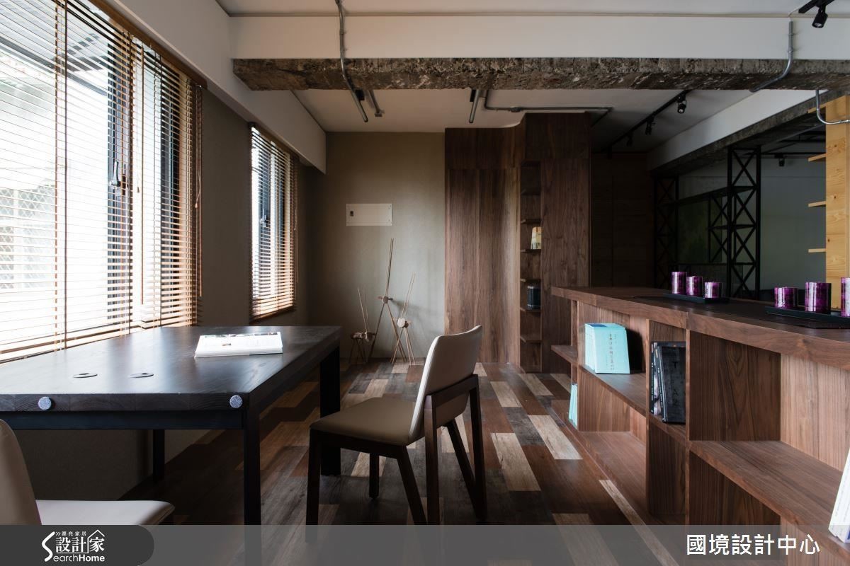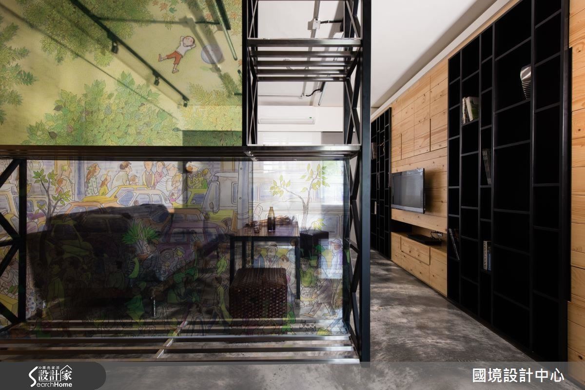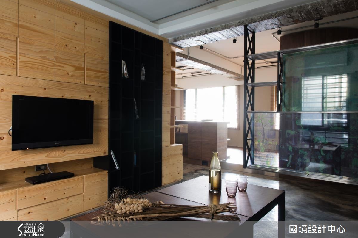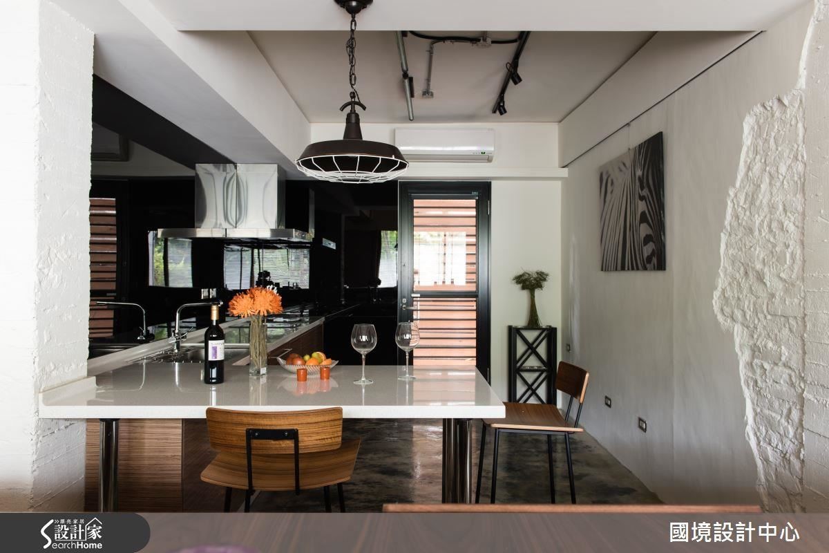 入門以大型圓弧櫃體拓增收納量度,並成為客廳通往其他空間的動線緩衝。利用鐵件與彩繪玻璃架起一道兼具置物機能的懸空屏隔,同時抹除穿堂煞疑慮。電視牆以大面積鋼刷木皮結合造型開放置物機能,搭配色調單純的家具,強調工業風格的純粹原味。保留原始天花高度,以粗獷的水泥樑面以及地坪材質差異,作為開放場域分野,並巧妙收整管線與軌道照明。因應屋主喜好,放大開放書房空間,將最明亮的窗邊區域保留給閱讀機能,大面積裸露紅磚牆讓人宛如身處咖啡廳。由於人口簡單,結合餐桌與一字廚房,利用黑玻與刷上白漆的裸露磚面,提升空間明度。
