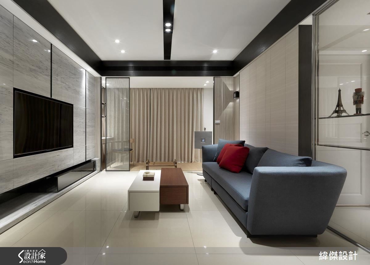 客廳電視牆面以切割如同玻璃厚度的石材,作為面板運用,與對面的繃布牆面彼此呼應,加上收納櫃體的木料板材,塑造溫暖宜居的空間氛圍,內斂卻深具質感。平面無把手的櫃面,提供平整牆面,確保在屋內行動時的安全。設計師大面積運用相同材質,加上表面的線條切割,在簡潔中塑造出變化的律動感。