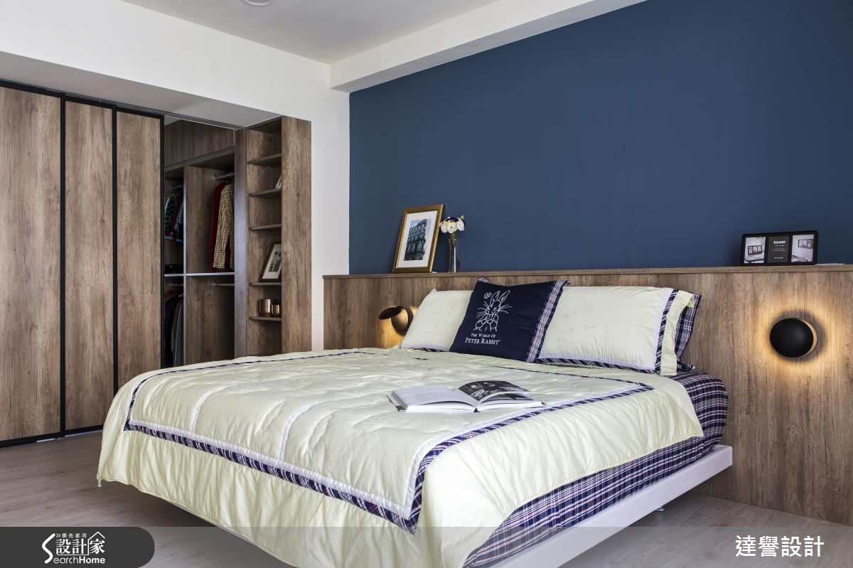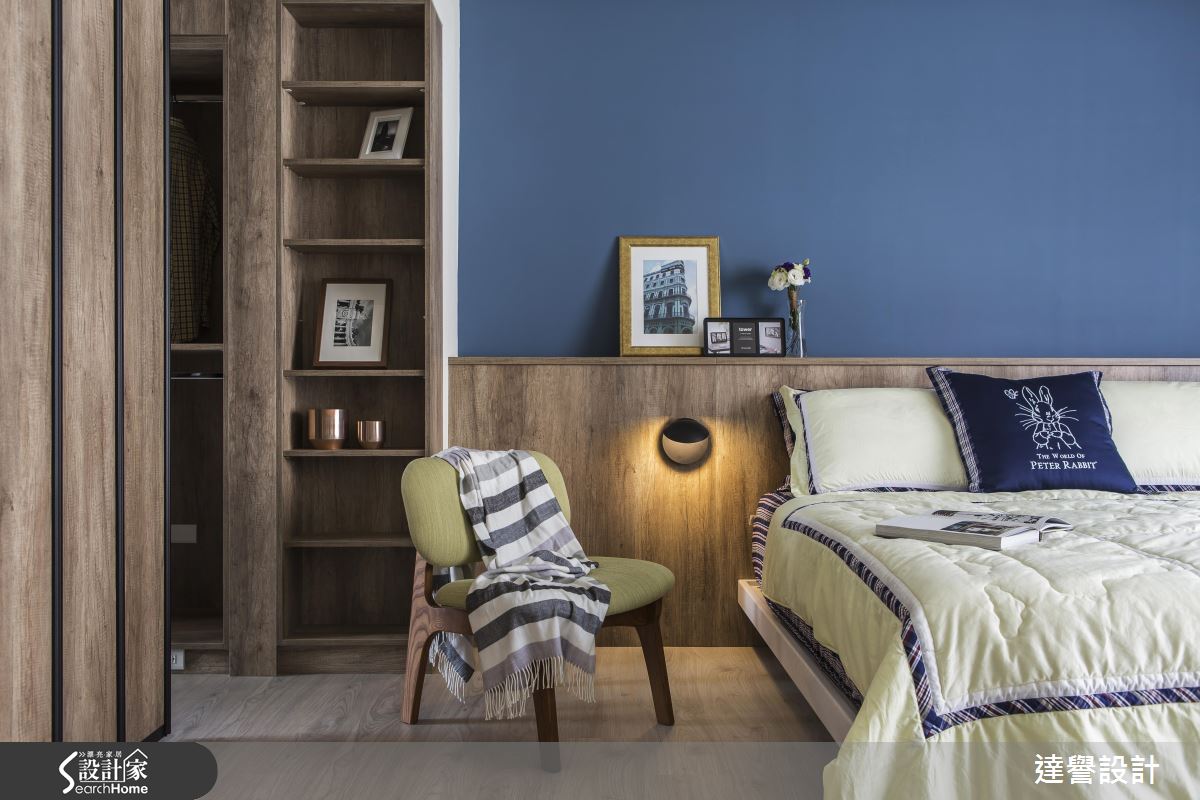 客廳處具有建築的結構樑柱,牆面上深灰色壁磚以交丁貼法,營造出如石砌般的效果,透過線條的交互穿插延伸,拉展了客廳上的視覺幅寬,看起來更加大器和開闊,而電視牆與原有牆面、柱體的落差深度,也形成了深邃的立體層次。為了正臨學習探索期的孩子,在許多轉角處也加入導圓角設計,以免孩子碰撞受傷,樓梯處則沿著轉角,在梯間打造出大型的收納空間、衣帽櫃,以及沙發旁的展示格等,便於拿取的高度配置,日常使用上也更加順手。在臥室的規劃部分,納入了更衣儲物考量,劃分出獨立的空間機能,床邊也利用系統櫃體收整立面,既避開樑柱結構的壓迫感,更挹注了實用的收納用途。