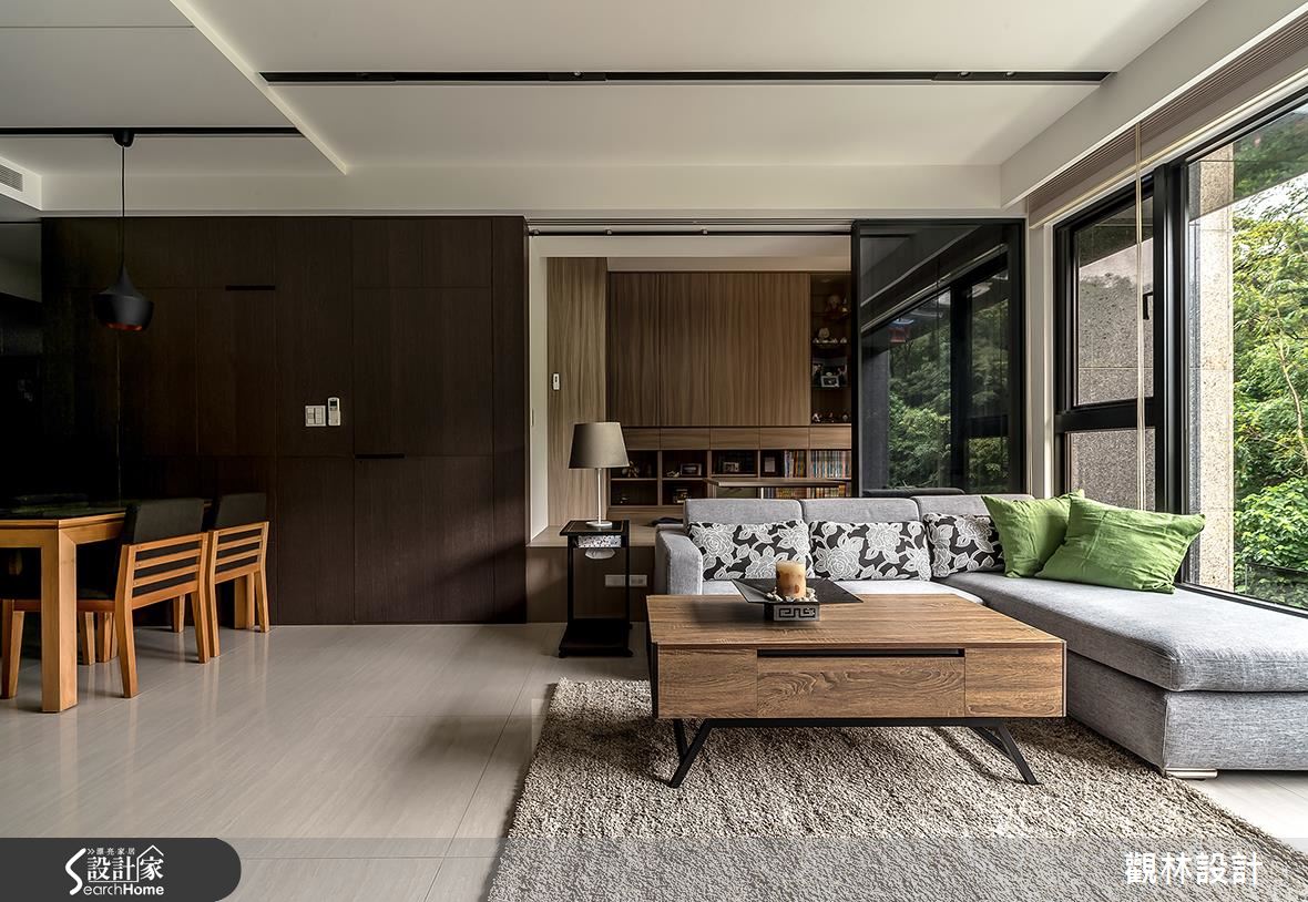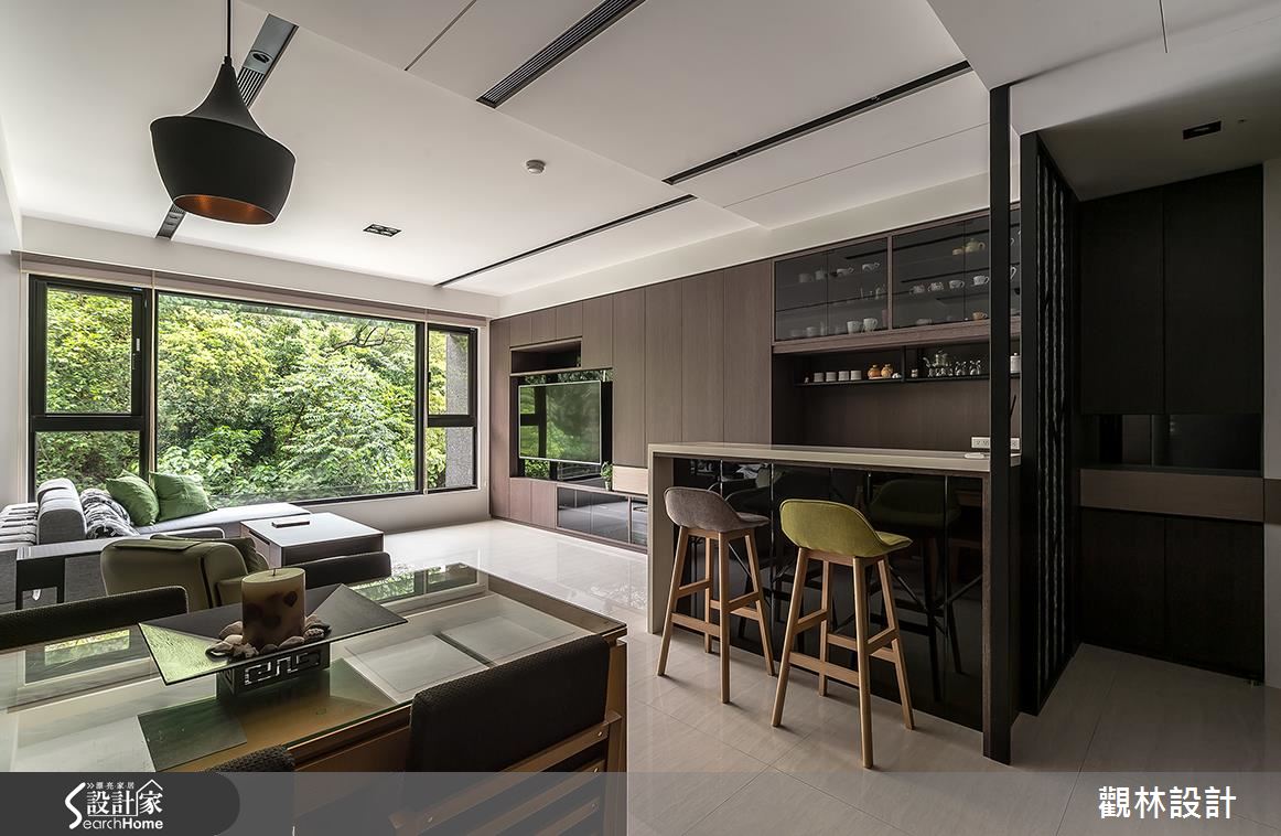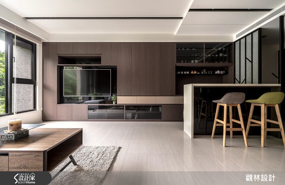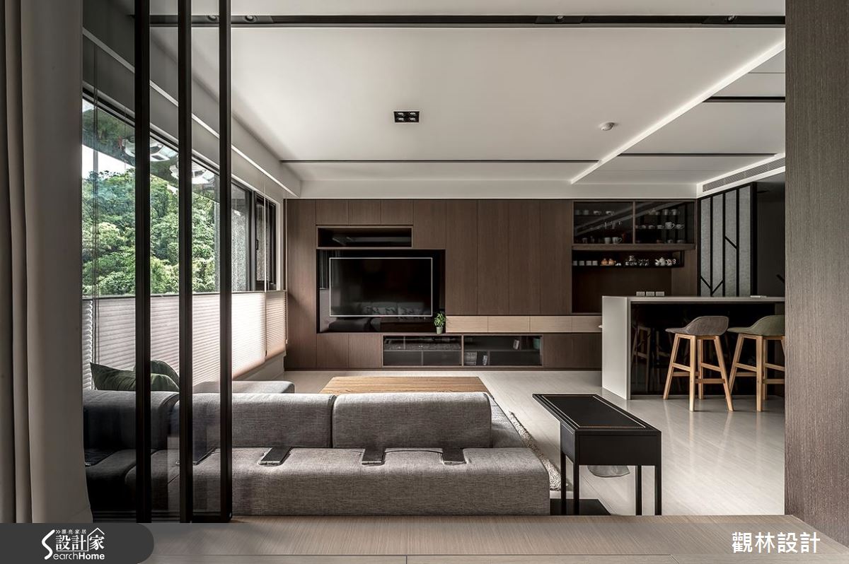 入口處,設計師採以鐵件搭構特殊玻璃,運用精緻的屏風圍塑玄關領域,一旁則保留局部透空、與室內吧檯相串接,讓人可在框景之中,接收到客廳的綠意窗景;延伸步入公領域,可見到無雜質的色彩配置,以木皮帶出樸拙的自然感受,並將電視牆整合櫃體機能,電視屏幕周邊亦做出造型開放格櫃,讓整道立面俐落平整,且達到收納的實用功能;沙發後方為書房領域,除了作為女主人在家工作的地方,也兼做孩子的閱讀天地,藉由活動拉門的存在,串起書房、客廳之間的開放關係,呈現充滿互動性的格局分配!