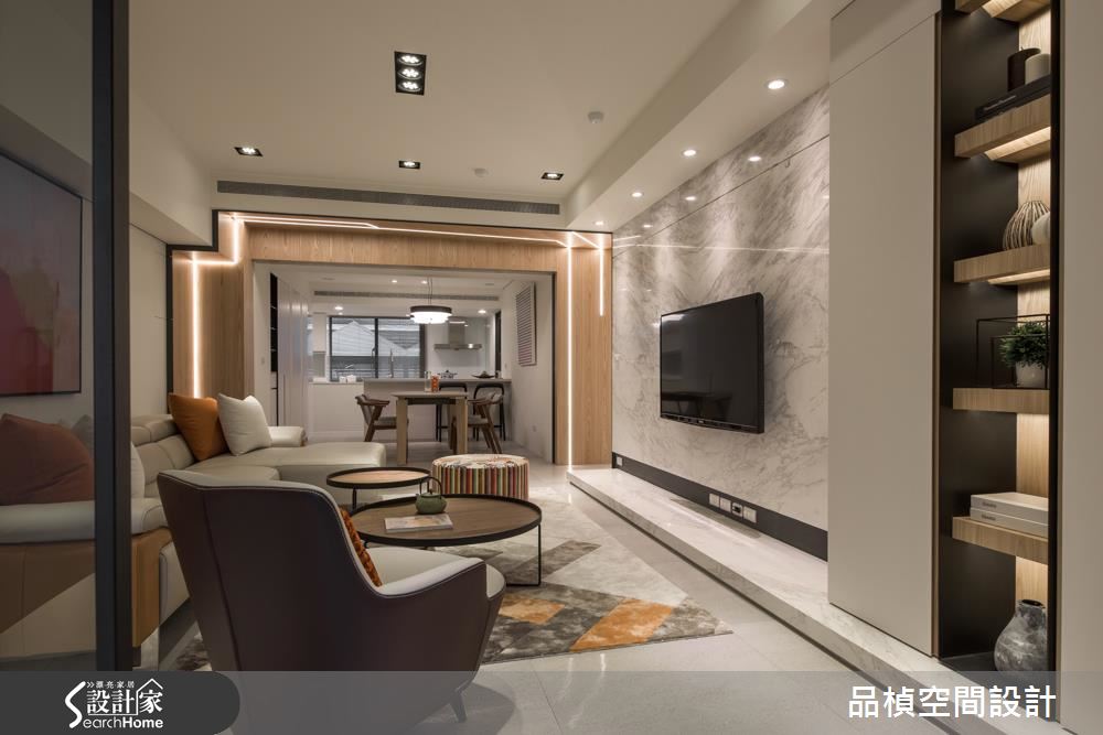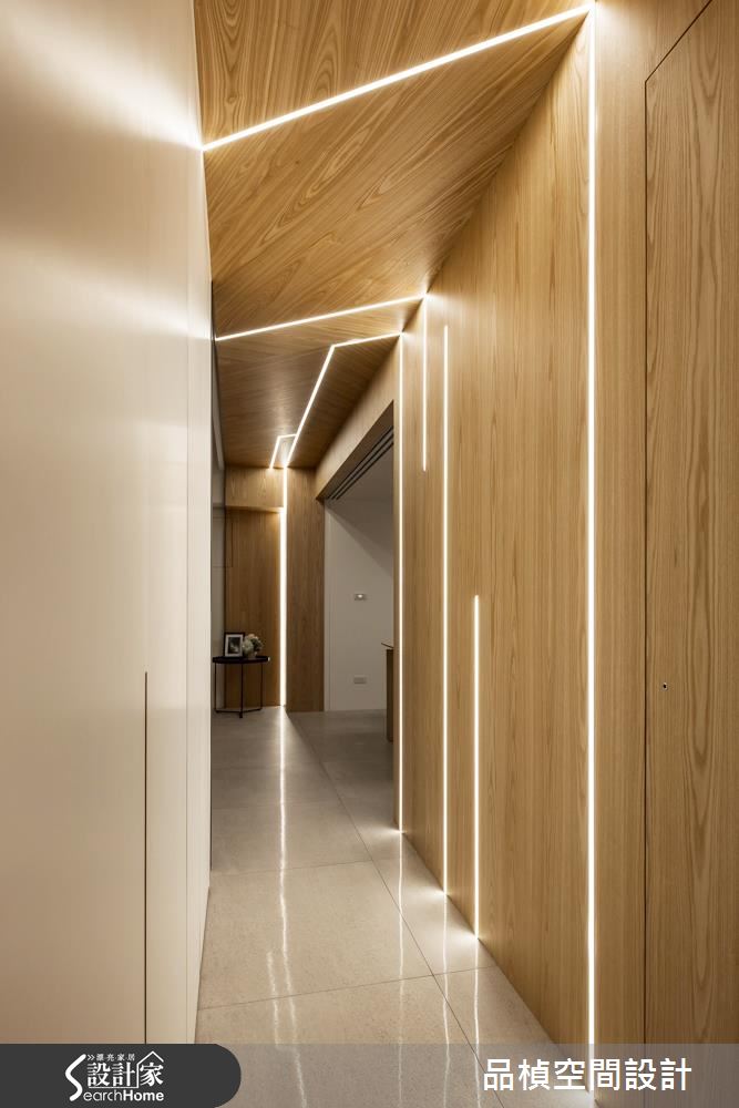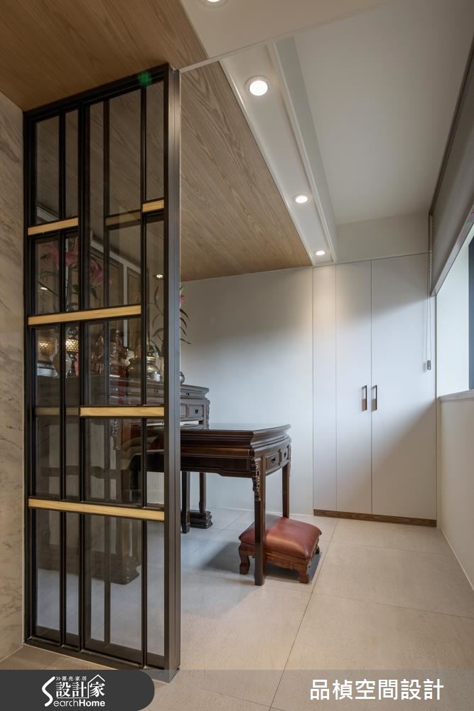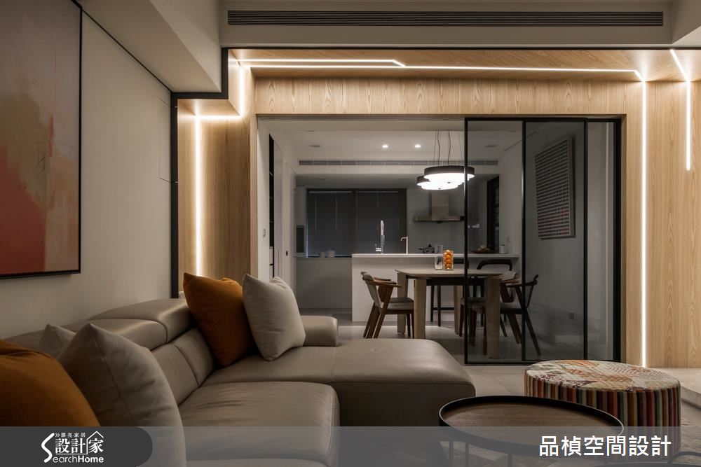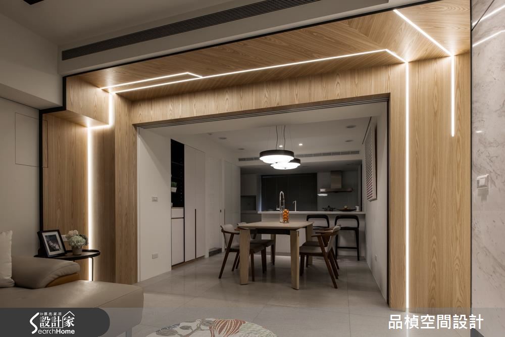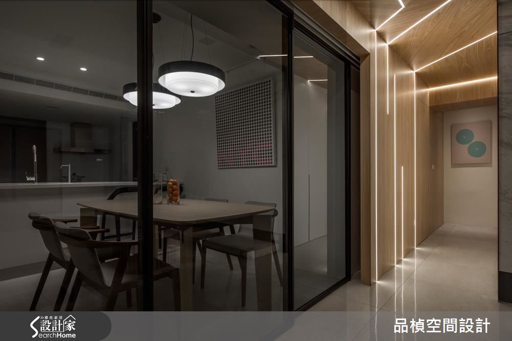 設計師重劃神龕與衛浴位置,接著調整公私領域比例,並打開領域視野,讓家人除了擁有寬裕的私人空間,更能在公共區域享受歡聚之樂。玄關以懸櫃提升視覺輕盈度,並採用易清潔的灰階地坪搭配灰玻,立刻就能打造穿透性十足的入門端景。接著設計師翻轉電視牆面向,讓動線更加順暢、提高家人互動度,巧妙以一扇灰玻拉門隔絕客廳與餐廚空間,隨時皆可依據需求開合。公領域的最大亮點,莫過於由餐廳門框延伸至走廊的不規則光帶,營造前衛中帶點溫馨的氛圍,也成為另類的照明機能。