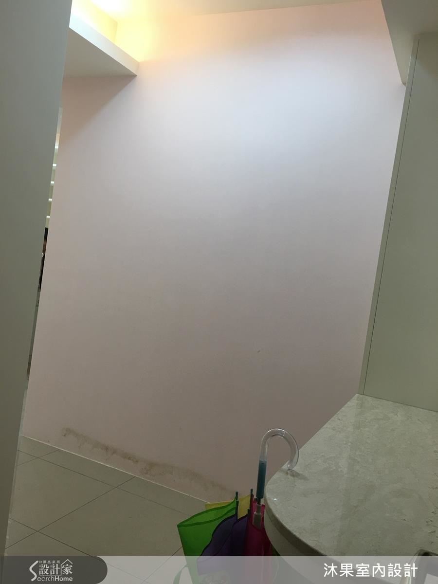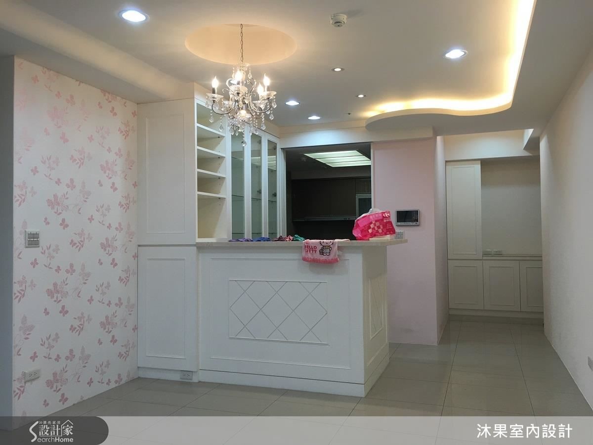 原有的隔間牆與櫃體讓人備感壓迫且陰暗狹窄,設計師拆除一半隔間牆、以吧台拓增置物機能,更貼心增設附有收納機能的穿鞋椅。另外利用格狀鏡面的假窗設計搭配純白壁板成功放大視覺空間、提升明度。