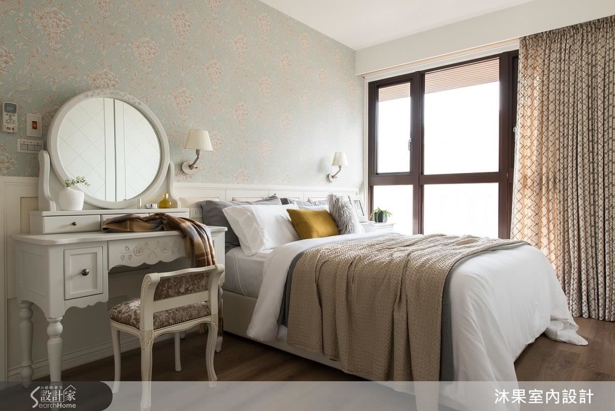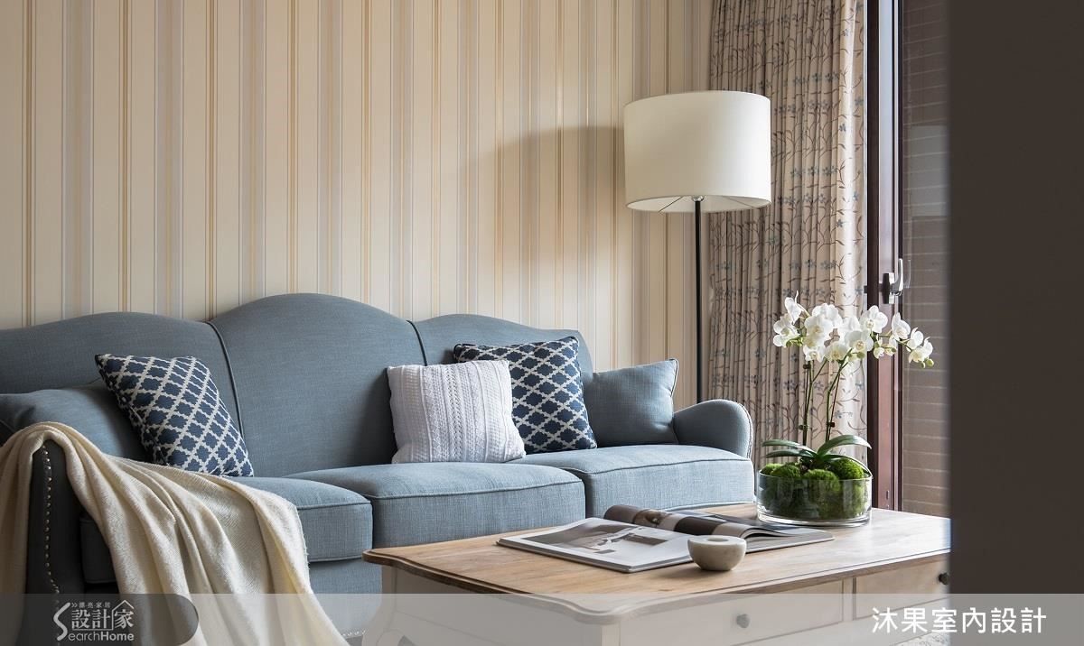 于設計師建議,壁紙是改變風格的一大利器,設計師為客廳選擇大地色與藍色相間的條紋壁紙,並將湖水綠複疊壁紙運用在臥室;在軟件選擇方面,跳色與簡單花紋的布織單品,便能打造溫煦清新的居家印象。