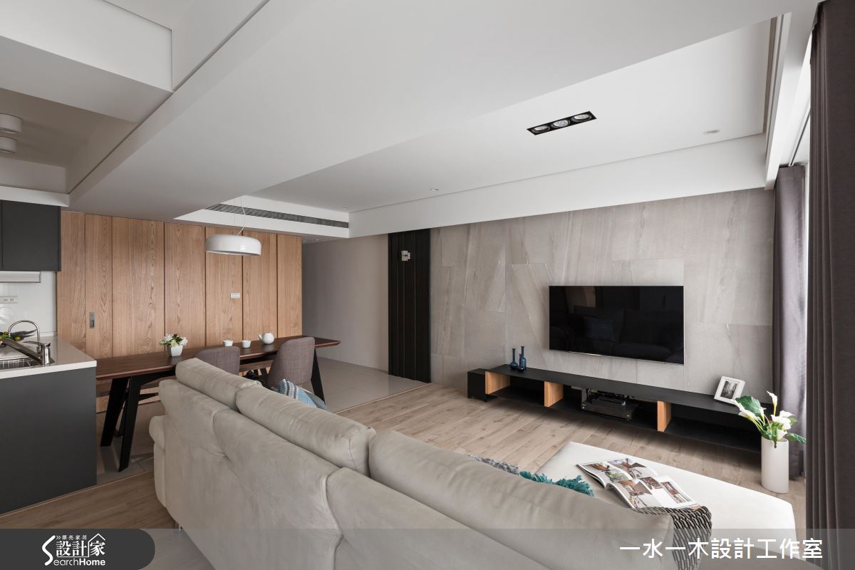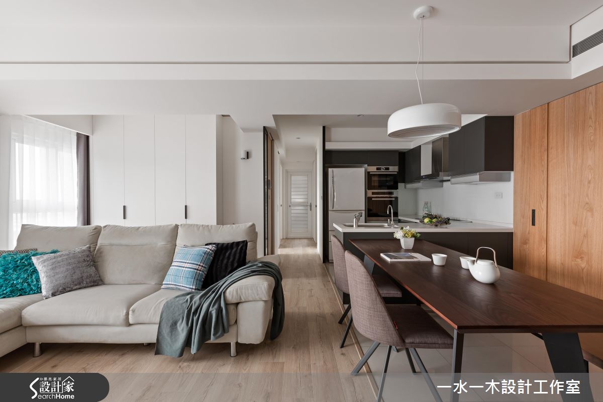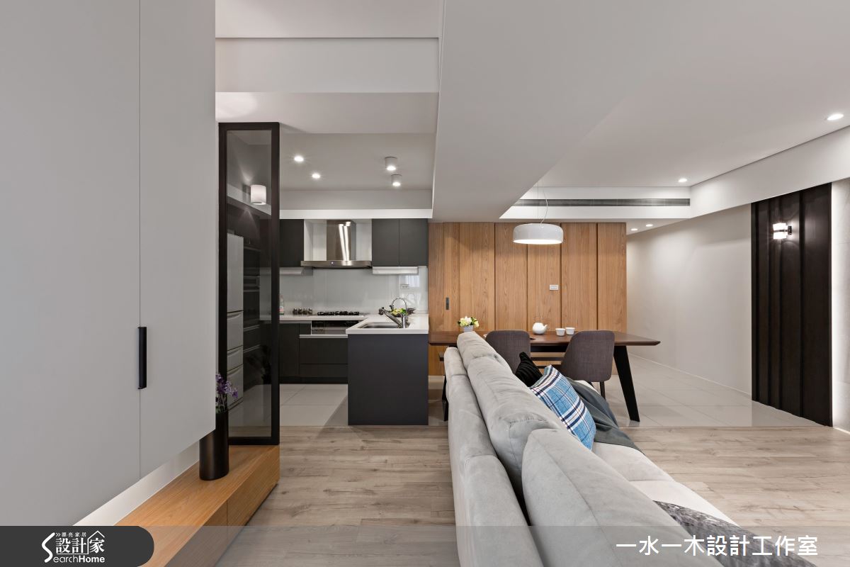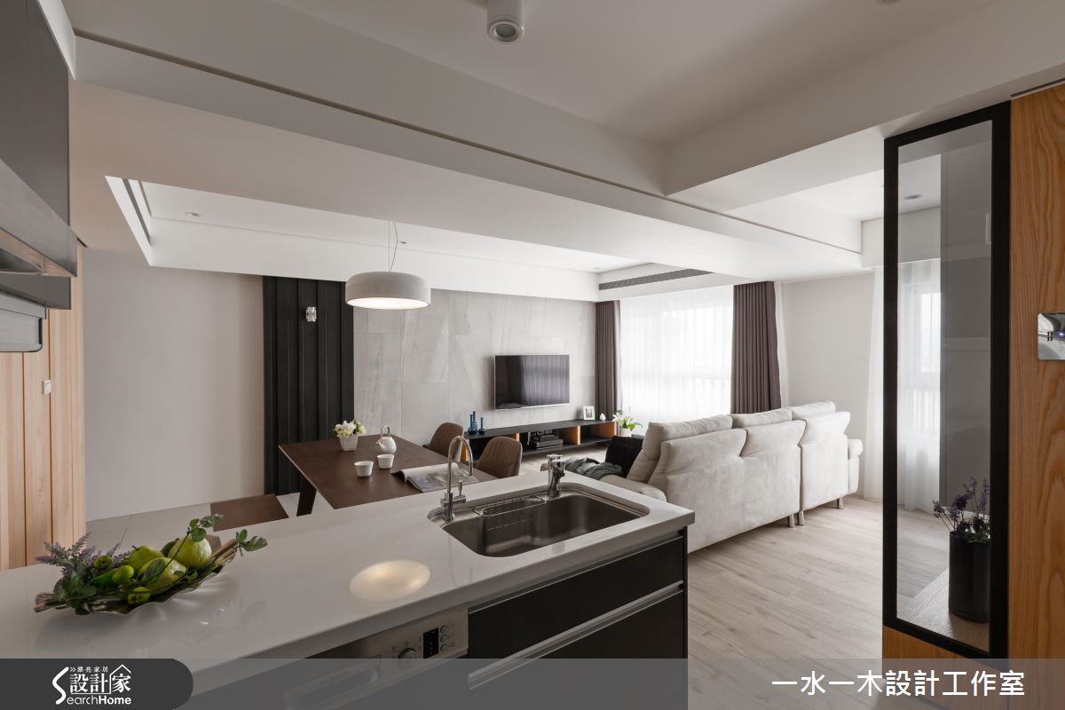 整體援引黑、白、灰等輕盈色調,並加入溫潤木皮做出調和,讓家在俐落的現代感中保有溫馨質韻,電視牆採以大面積的灰色進口磚做鋪陳,彰顯天然的建材質紋,天花板則保有簡潔流線,創造延伸空間感,並留出沙發後方的一塊空地,規劃櫃體挹注機能,對應著窗簾篩落的自然採光,展現更為通透無礙的空間感;餐廚呈開放式佈局,串接起烹飪與用餐的互動交流,並藉由木質元素打造牆面,一旁銜接現代風廚具設備,混搭出充滿對比之美的立面表情!