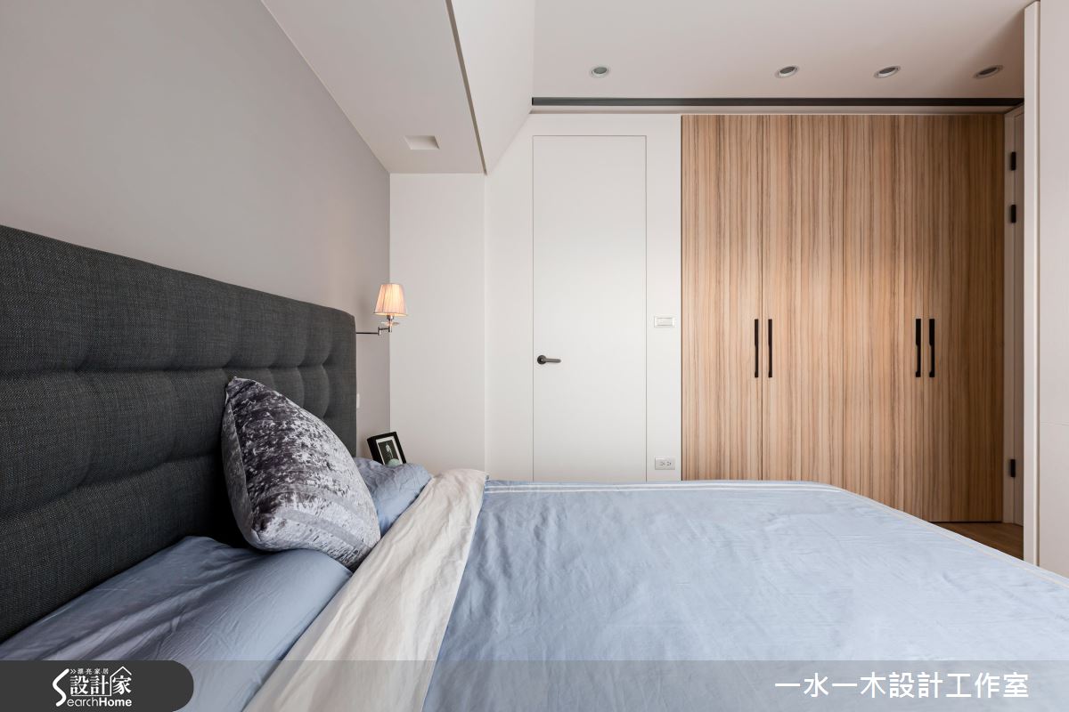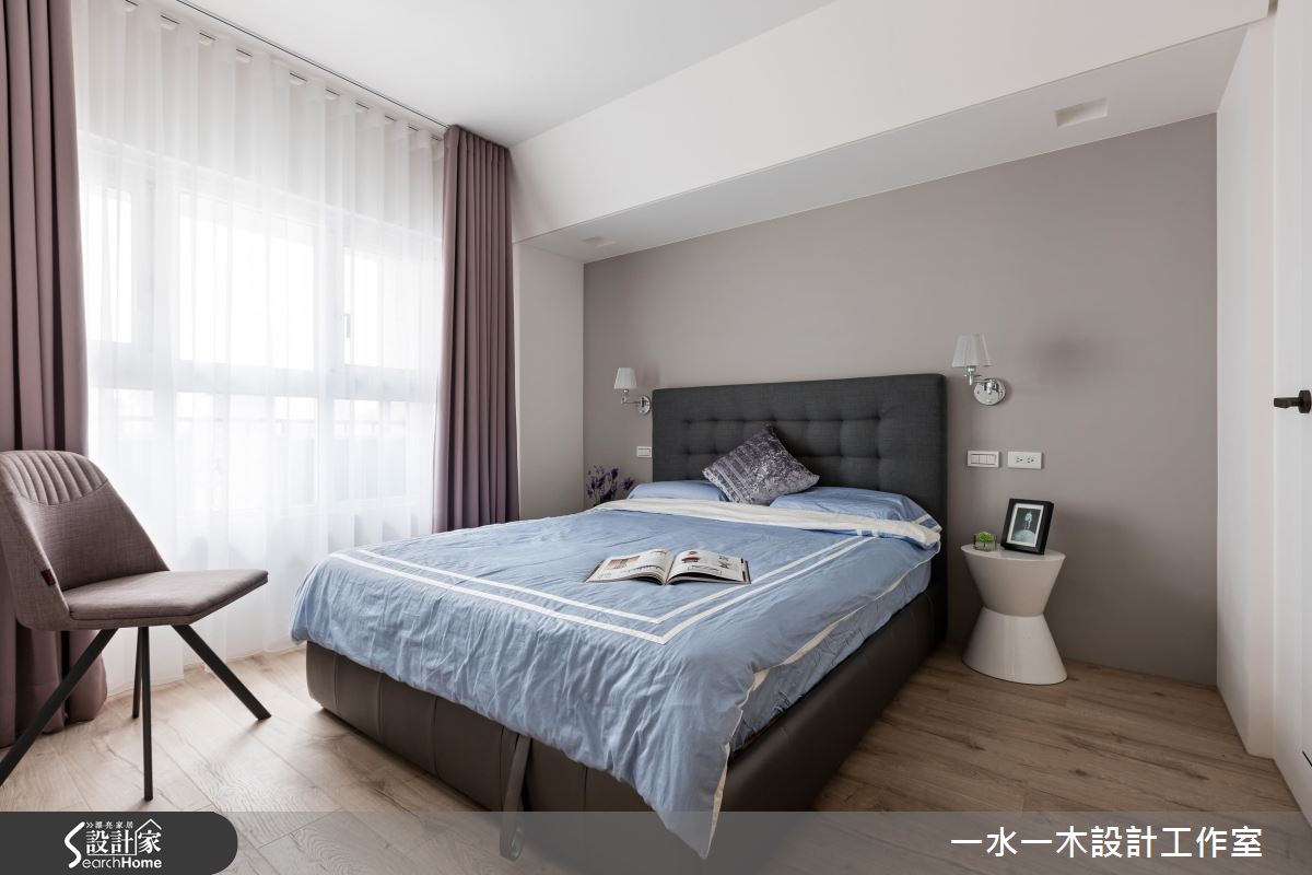 寢臥,運用淺灰色強調雅致溫暖,在床頭兩側妝點柔和光源,櫃面則融入有溫度的木作,既清新又沉穩,實踐屋主嚮往的品味生活!