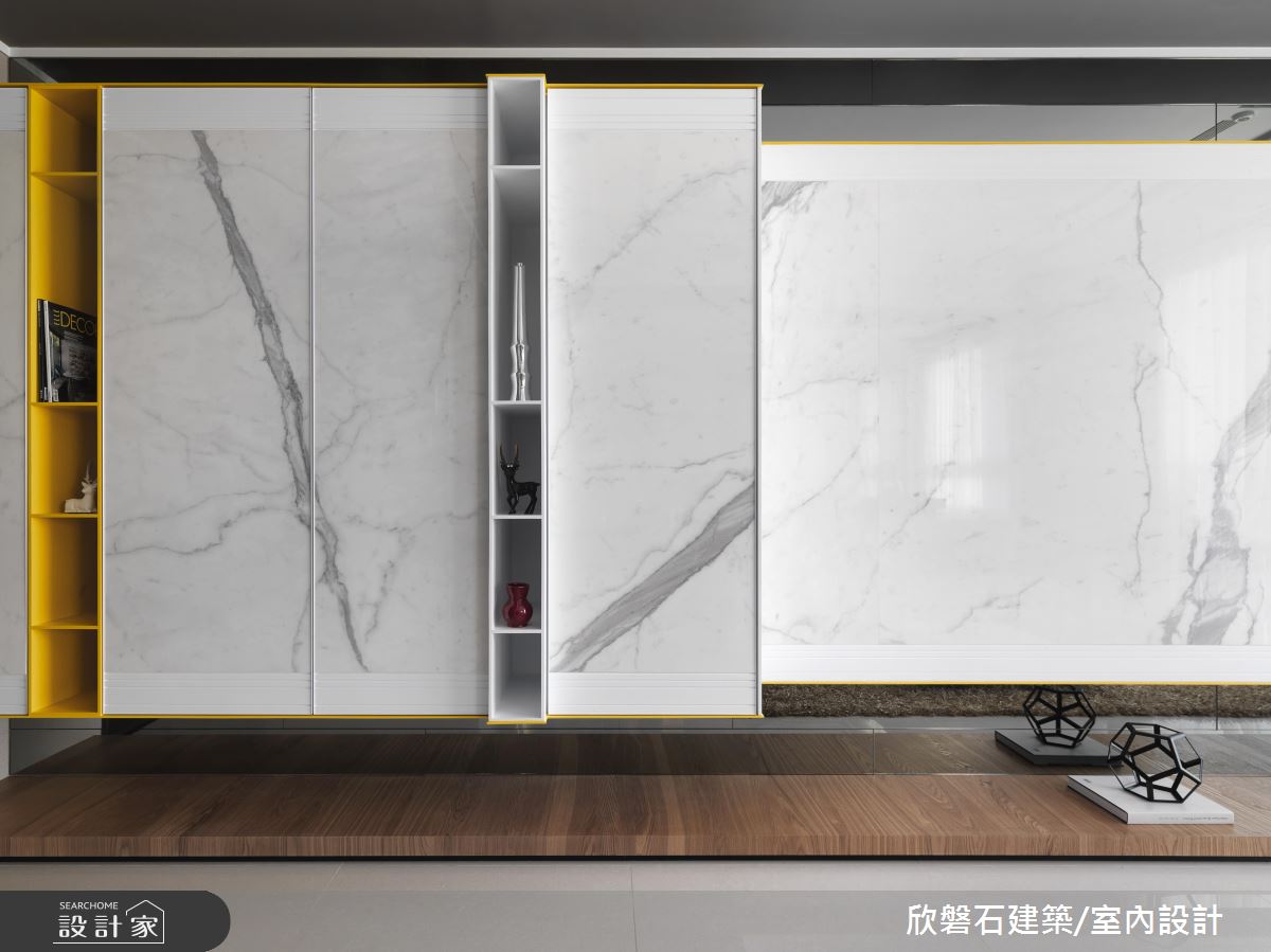 以開放式設計串連公共空間,並將客廳、餐廳與多功能書房置於同一動線,順利延展視覺感受。客廳以大理石薄片磚與鮮黃跳色櫃體營造富有質感卻不失趣味的電視牆端景,以附有收納機能的木質矮櫃包覆沙發周圍,巧妙與天花形成開放場域的無形界定。與備餐檯結合的餐桌,成為一家人最完美的互動場所,無論用餐、遊戲、閱讀烹飪皆可一起完成,正上方的夾娃娃燈更為用餐時光增添童趣氣氛。以不及頂灰玻特別規劃的多功能房在孩子年幼時能成為方便父母照看的遊戲室,後續更可調整成為書房或客房用途。