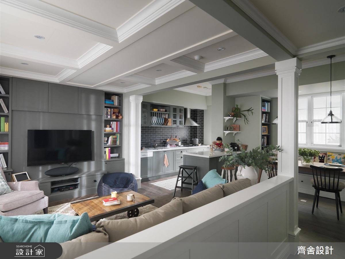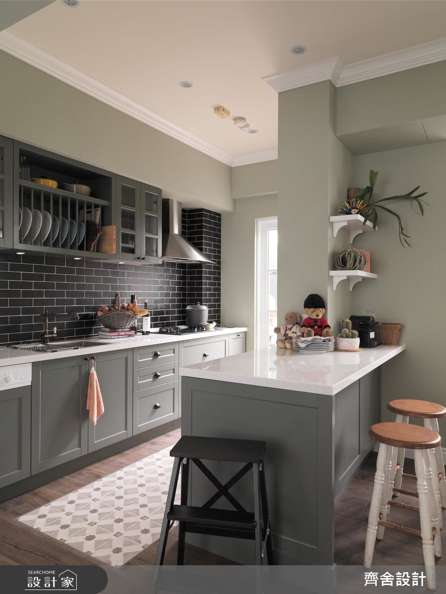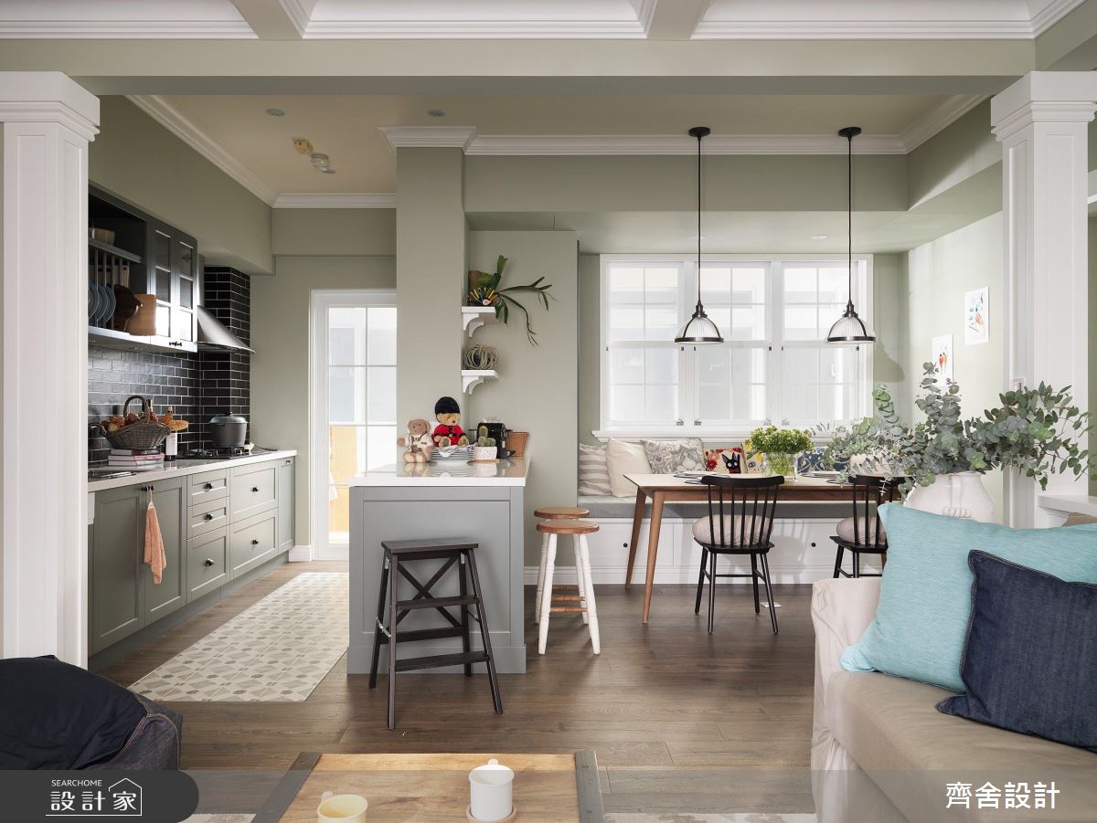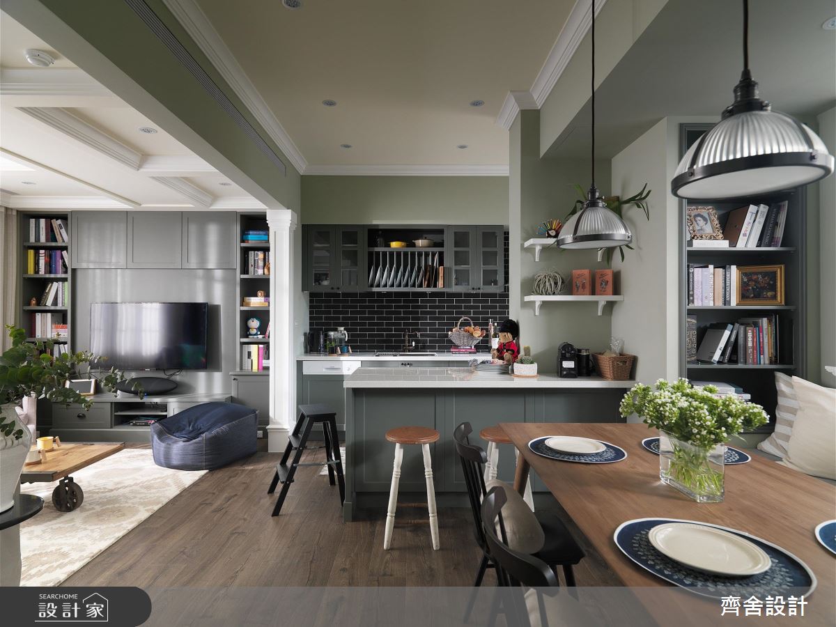 為了植入道地美式風情,首先設計師以開放設計串連客廳與餐廚空間,維持家人間的高度互動性。入門巧妙以矮牆劃分玄關位置,為百葉收納櫃提供充裕的應用空間,客廳天花以格狀造型線板營造視覺層次、化解大樑問題,結合收納櫃機能的鐵灰色電視牆搭配布織沙發、單椅與工業風桌几,呈現美式風格的經典的混搭休閒風情。餐廚空間的天花與壁面皆刷上綠階色調,巧妙與客廳產生區隔,臨窗而設的 4 人餐桌搭配臥榻,讓用餐也能做場日光浴,雙面電器櫃與吧台結合,成為廚房與餐桌的連結,更能兼具備餐、休憩的機能。特意在廚房地坪加裝進口磚,與木地板產生區隔,並維持料理區的整潔度。