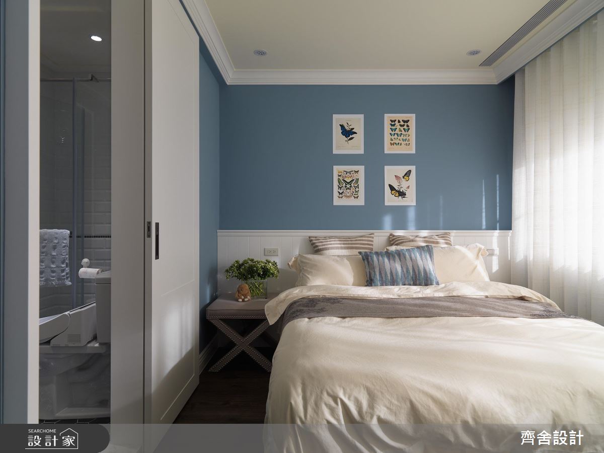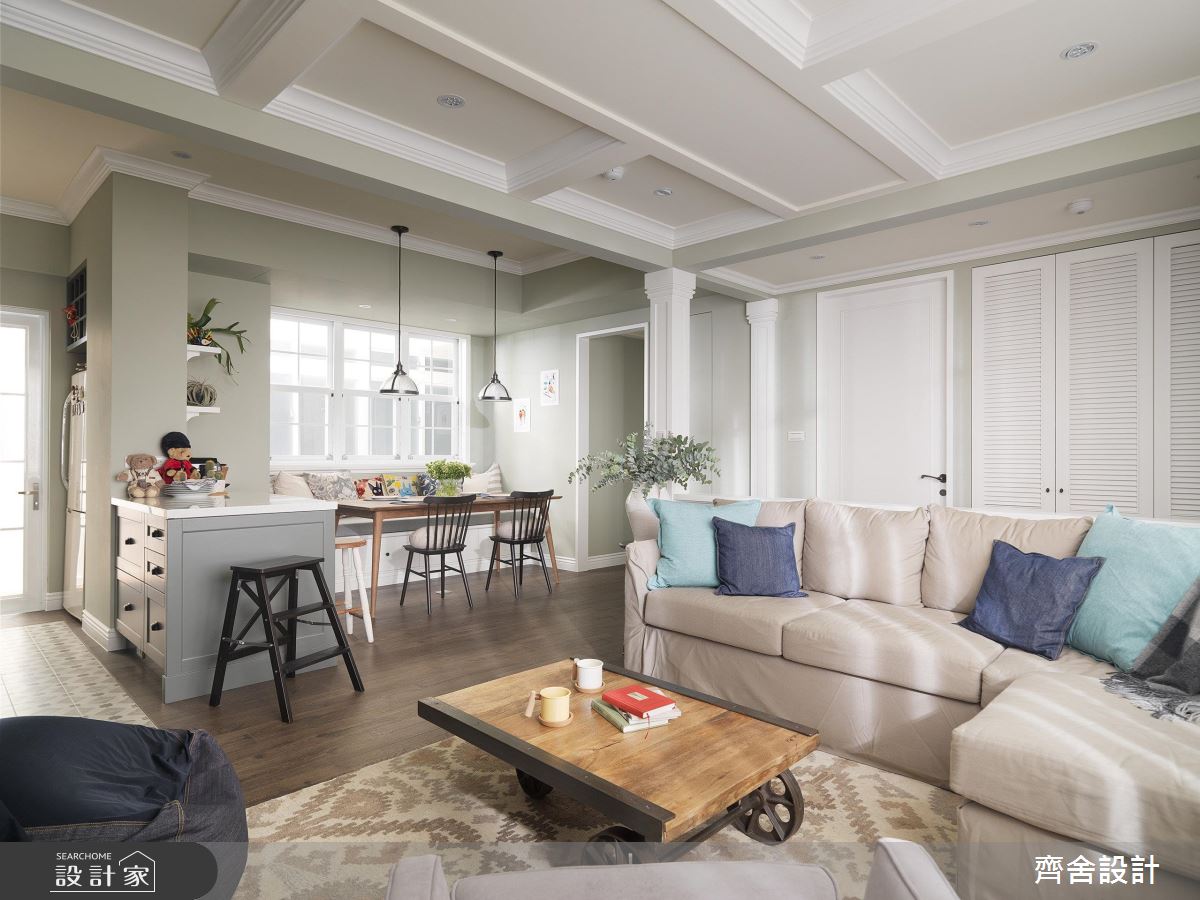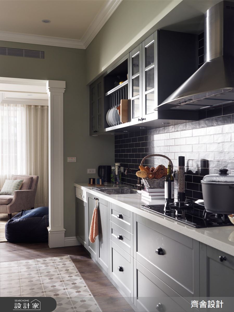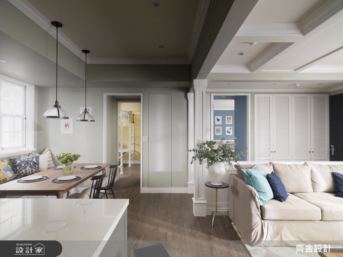 為了植入道地美式風情,首先設計師以開放設計串連客廳與餐廚空間,維持家人間的高度互動性。入門巧妙以矮牆劃分玄關位置,為百葉收納櫃提供充裕的應用空間,客廳天花以格狀造型線板營造視覺層次、化解大樑問題,結合收納櫃機能的鐵灰色電視牆搭配布織沙發、單椅與工業風桌几,呈現美式風格的經典的混搭休閒風情。餐廚空間的天花與壁面皆刷上綠階色調,巧妙與客廳產生區隔,臨窗而設的 4 人餐桌搭配臥榻,讓用餐也能做場日光浴,雙面電器櫃與吧台結合,成為廚房與餐桌的連結,更能兼具備餐、休憩的機能。特意在廚房地坪加裝進口磚,與木地板產生區隔,並維持料理區的整潔度。