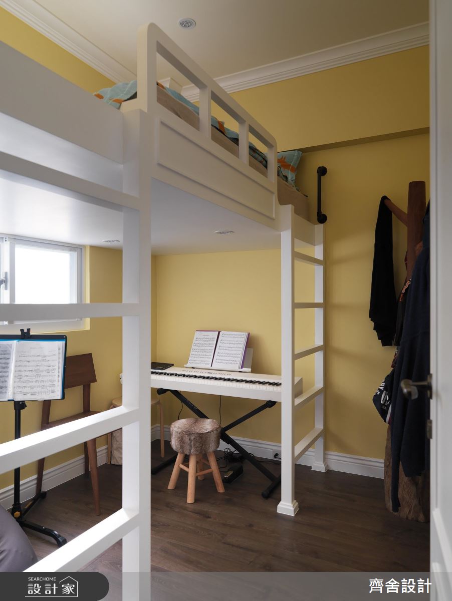 私領域以鵝黃與水藍色凸顯各孩子與爸媽的性格需求,更配合孩子對於音樂的喜好善用垂直空間,打造專屬練習室。