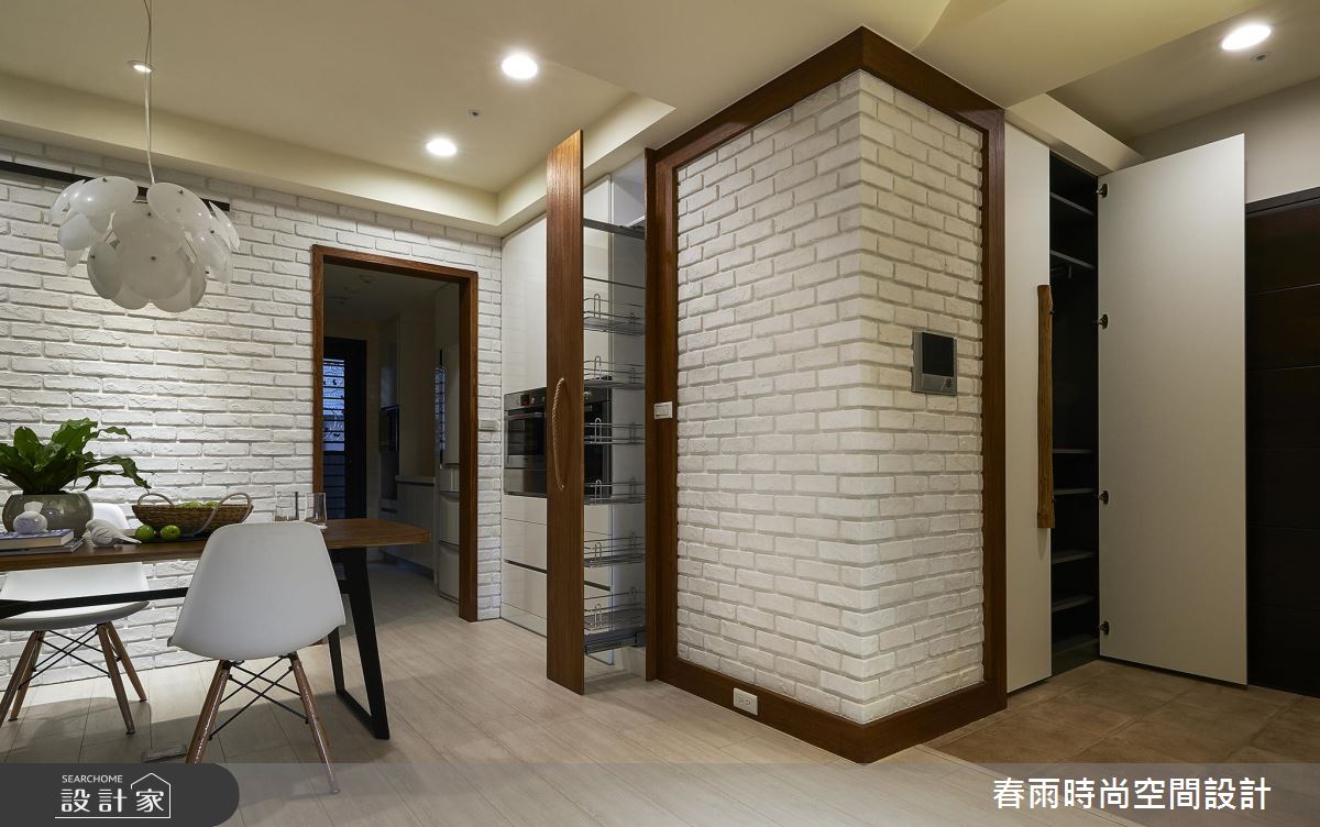 公領域以白色、木色作為基底,採用木地坪鋪陳全室,搭配落地窗的採光映照,烘托廳區的寫意氛圍,主牆則賦予獨特表情,融入文化石為背景,巧妙給予局部留白,並以一道木皮造型延伸天際,透過延伸脈絡及溫暖木皮象徵大樹,型構守護與庇蔭的喻意,而冰冷的金屬鐵件飾邊,更適時調和了整體的木作暖意,勾勒時尚兼有溫馨感的生活氣場;同時,將文化石延伸至餐廳領域,藉由文化石的包覆修飾結構柱體,再藉著牆面深度與木作掩飾,加入可抽拉式的收納櫃體,充分運用居宅坪效;來到寢臥,則可見大容量的木質衣櫃,兩側加入工業風鐵網元素,保留局部的展示透空,在粗獷與溫潤之中,帶入居住者的個性魅力!