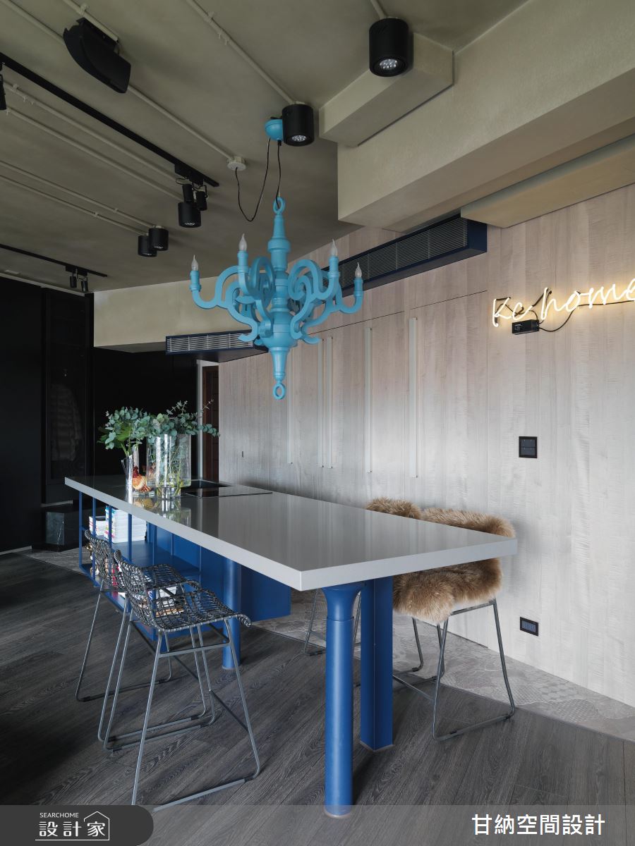 公領域挹注「自由動線」概念,從玄關起始,運用牆面、量體、家具的引導,擘劃出一道隱形圓弧動線,無形中賦予客、餐廳和中島廚房之間的流暢互動,並充分整合吧檯旁的立面軸線,隱形掉廚房、衛浴等入口,以細緻木皮呈現清爽的牆面表情;機能表現上,除了於電視牆加入隱藏收納,用以收整衣帽、模型車與設備等,也在吧檯底部置入展示書櫃,兼具生活實用性及美化作用;而木皮、木地板與黑色調所構築的背景,則烘托出藍色的主題性色調,將亮眼的藍揮灑於織品、磚牆、抱枕等處,搭配一座充滿古典氣息的吊燈,替工業風底蘊注入強烈的衝突美感;臥室則顯得溫暖而繽紛,巧妙在床頭規劃紅色格子窗、打造更衣隔間,創造獨樹一幟的起居風景,衛浴也藉由紅色飾品畫龍點睛,醞釀藝術性十足的空間氛圍!