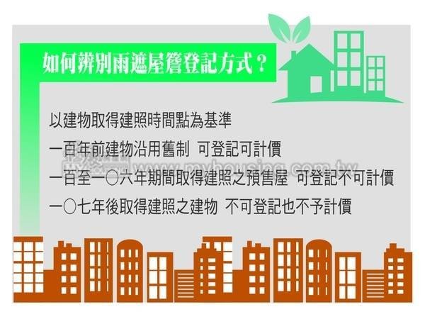 為導正此一扭曲現象,內政部於是在民國一百年五月修訂《地籍測量實施規則》,規定爾後推出的預售屋,其雨遮及屋簷可登記,但不予計價。接著更在去年底決議,自明(一○七)年一月一日起,所有建物(含預售屋及成屋)的雨遮及屋簷,皆採不予登記也不計價之原則,也就是不再屬於附屬建物。