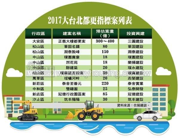 住展雜誌市調資料顯示,大台北都更案量已連續二年大增、並續創新高紀錄;一六年跳升至約六九四億,一七年案量低標可望放大至一○五○億,顯示都更推案動能相當充沛,大部份都更案都位在菁華區、且是逾十五億元以上的指標案。
