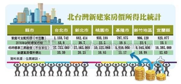 據行政院主計總處所發布的數據,北台灣以台北市每戶家庭可支配所得(中位數)最高,約為一一三點四萬,但最近一季新建案均價也最高,達到八三點九萬/坪;中位數房型的四十五坪標準三房,總價約三七七六萬,則每一家庭購屋所得比高達三三點三年,代表要不吃不喝三十三年以上,才能買到一間新房子。