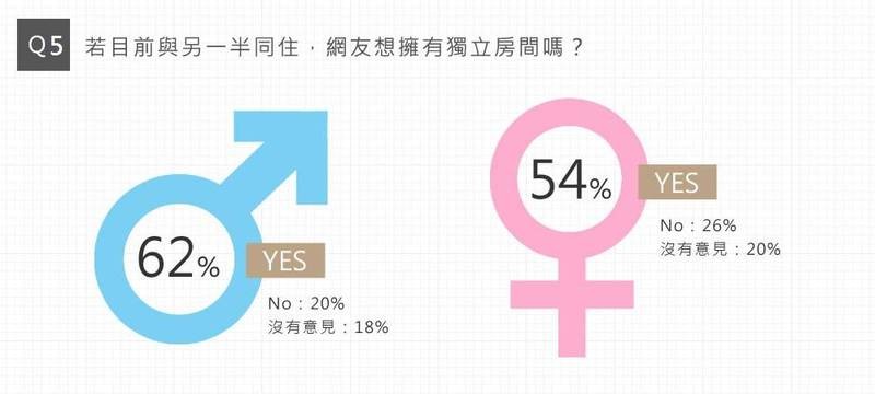 再進一步詢問,與另一半同房的網友是否希望有自己的獨立房間?超過半數的女性(54%)以及6成2的男性網友,表示希望能「恢復單身」,擁有自己的獨立房間,調查結果顯示,比起增進與另一半的相處時間,民眾更加希望能有可以「自己做主」的空間。