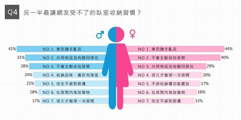 另一半東西隨手亂丟、不懂主動收拾、沒有物歸原位!網友想「恢復單身」!同住在一個房間內,若與室友的收納習慣不同,絕對令人非常頭疼!根據本次調查結果,最令人困擾的室友收納習慣前三名,依序為「東西隨手亂丟,認為同房居住者才是混亂的根源」(43%)、「不會主動收拾,總是自己在整理房間」(37%),以及「不會把東西歸回原位,讓自己常常找不到共用物品」(31%)。