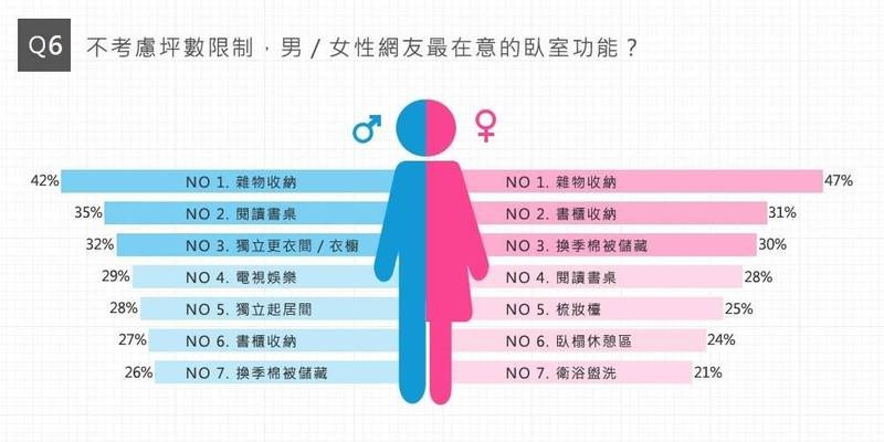 當問到臥室該如何規劃?男、女性網友的觀點也相當不同,女性網友希望臥室內能有充足的收納規劃,包含雜物收納(47%)、書櫃(31%),及換季棉被儲藏(30%);男性網友則相較女性更期待臥室內有多元的機能性,例如閱讀書桌(35%)、獨立更衣間或衣櫥(32%)、電視娛樂(29%)等安排,希望回到房間就能充分放鬆休息。