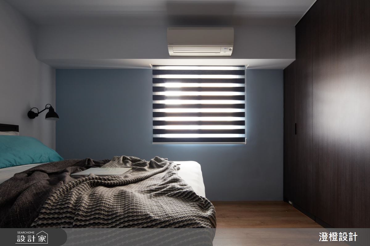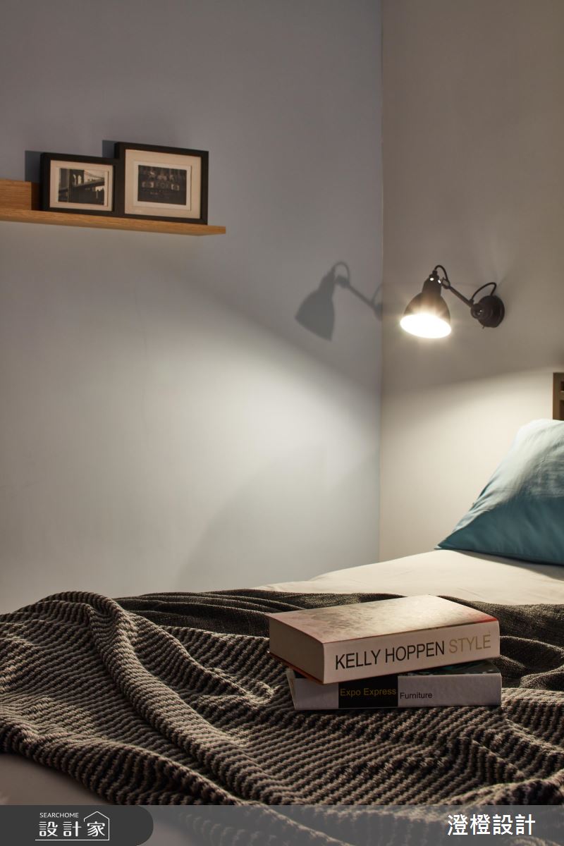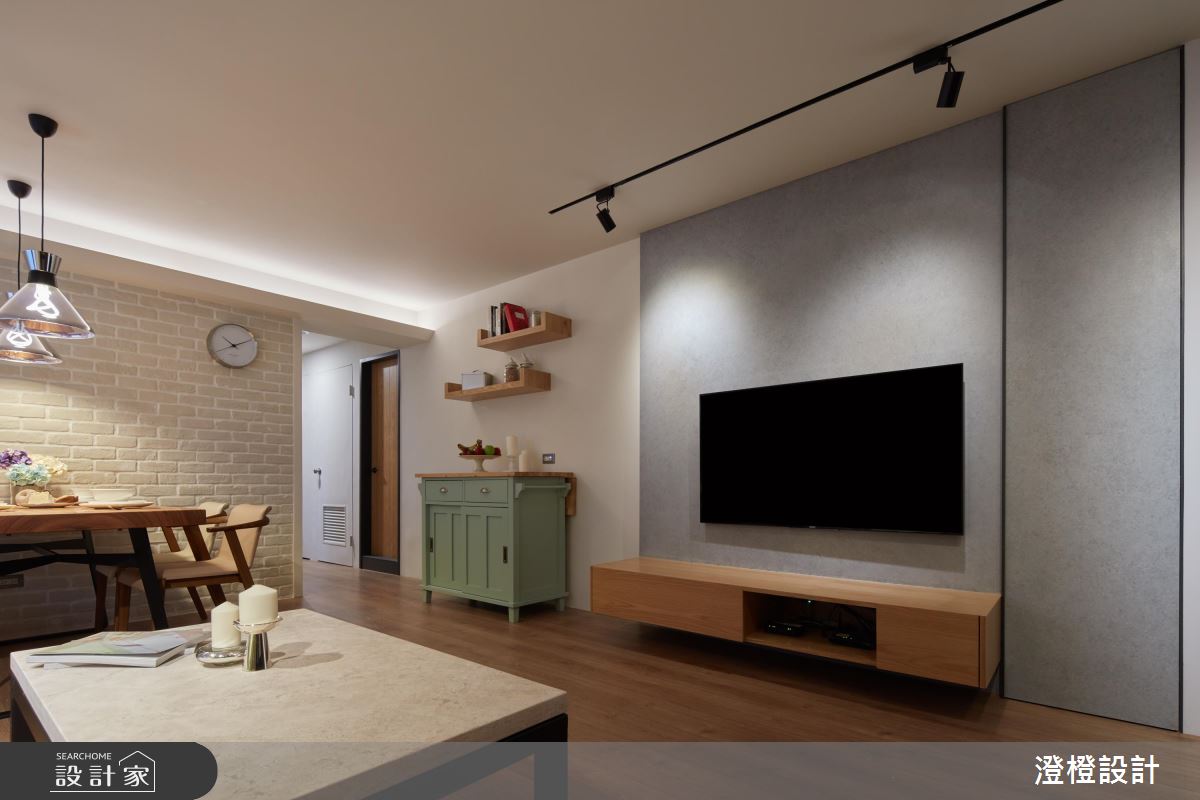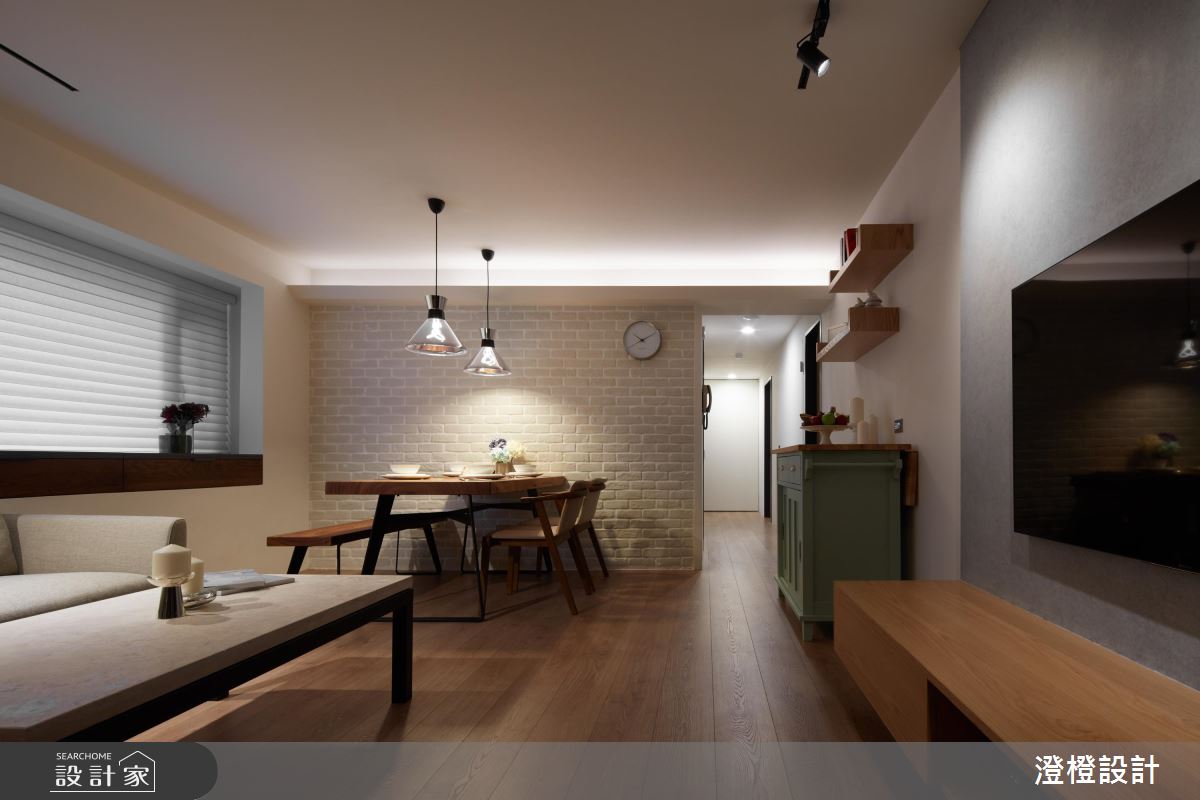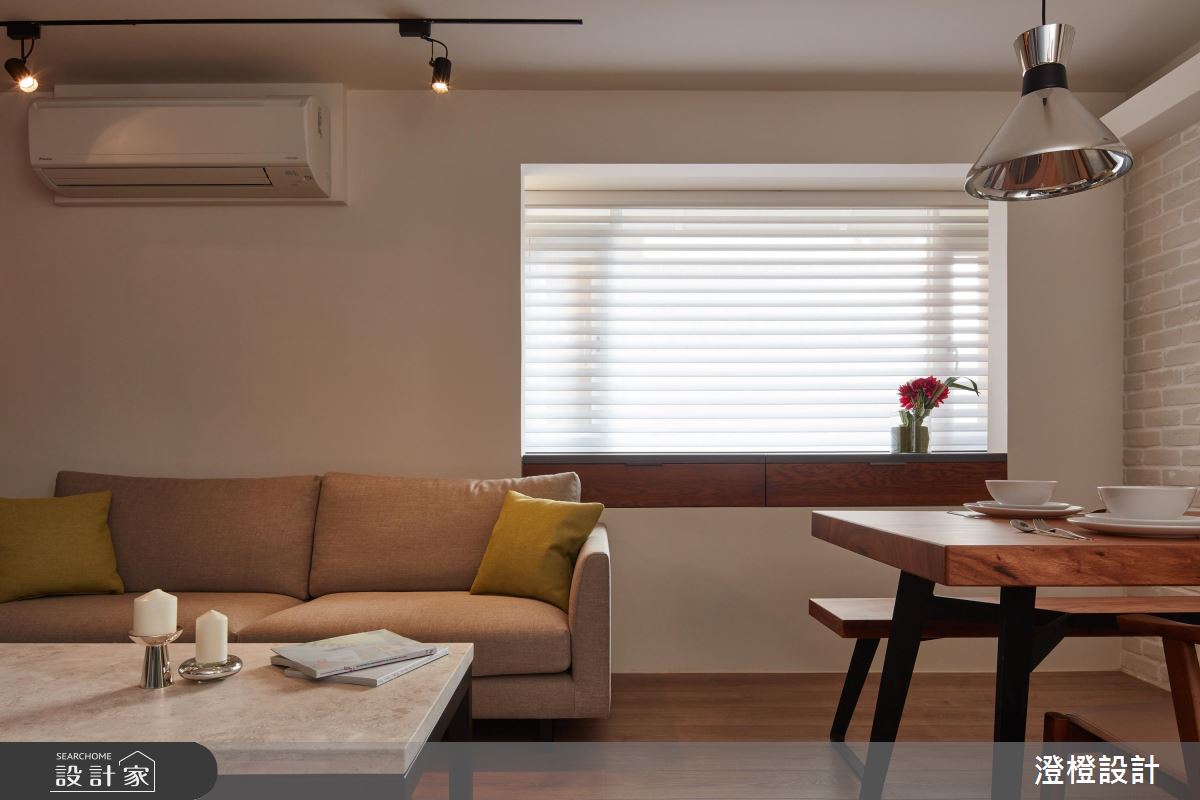由於原本屋況採光較集中在廚房和臥室,客廳區則略為昏暗,設計師藉由擴大窗戶面積,並善用窗戶與牆體的深度,延伸木作抽屜櫃,除了增加了收納的效益,平時也能作為展示平檯的功能。至於材質的選擇上,電視牆運用清水模的溫潤質理,再嵌入訂製烤漆鐵件線段,增加俐落大方的簡約時尚感,餐廳則運用象牙白文化石,鋪排出溫和、恬雅的空間表情,搭配燈光照明,讓日常起居、用餐都能有置身於人文咖啡館的閒適感受。臥室區將收納櫃延伸,巧妙隱藏了衛浴空間的出入口,塑造簡約乾淨的私領域畫面。