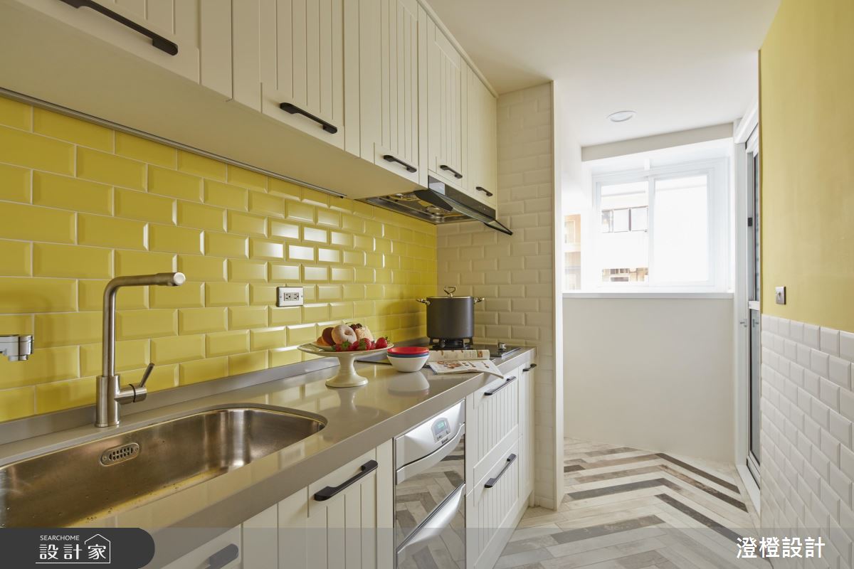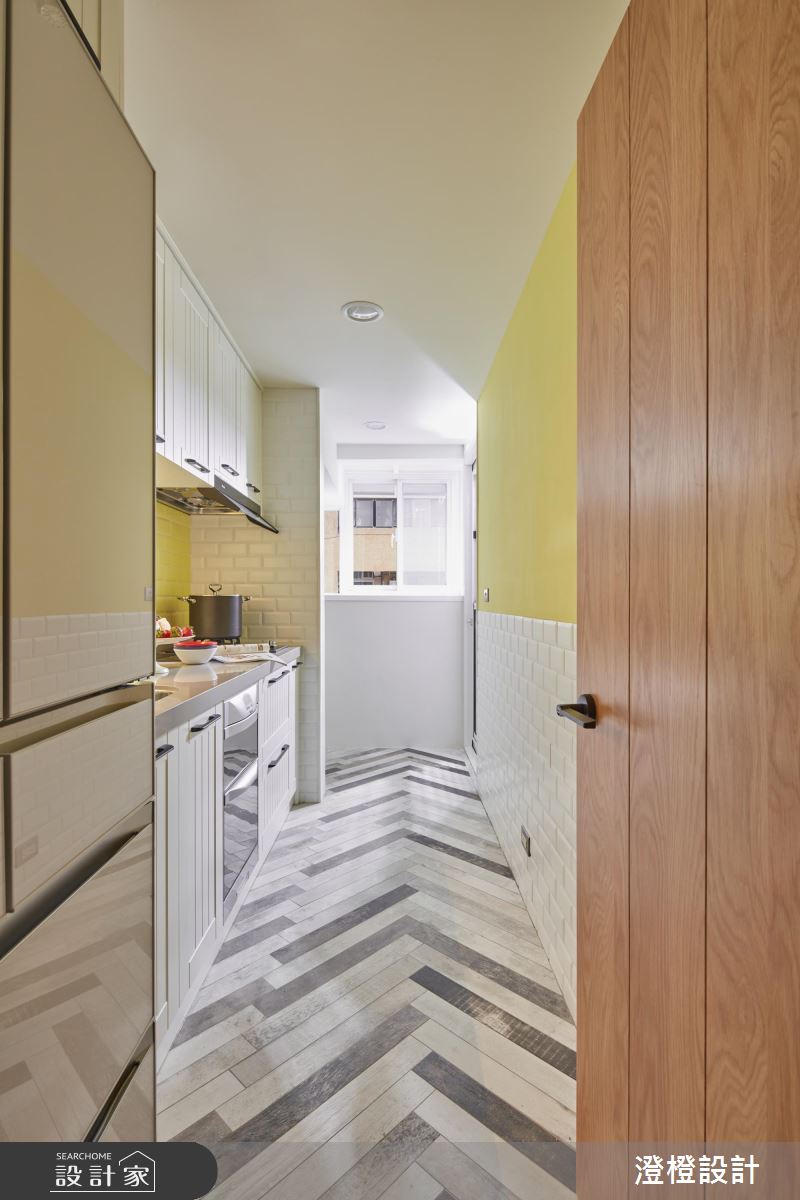 廚房安排於陽光充足的採光區,牆面運用亮黃色復古磚鋪排,挹注明亮愉悅的空間氛圍,同時也因應屋主常下廚的習慣,地坪鋪設便於清理保養的木紋磚,採用人字拼法,更營造出獨特的時尚感。