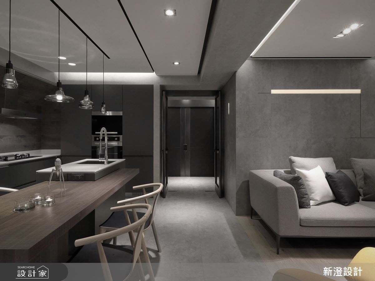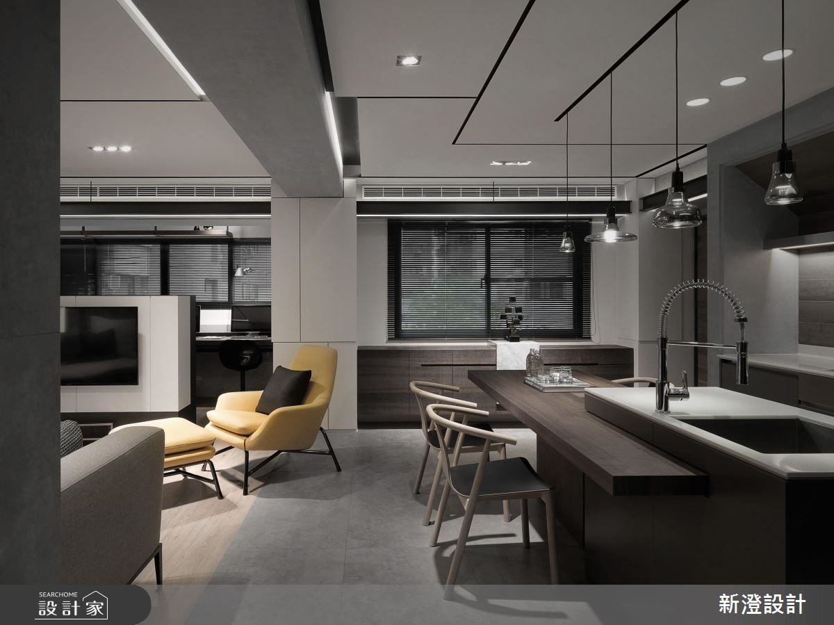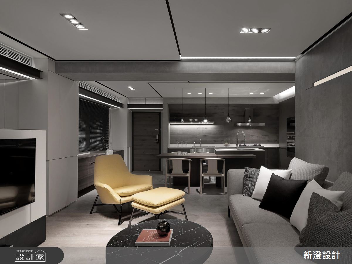 原先公領域格局狹小封閉,設計師以玻璃雙拉門打開玄關視野,將大坪數常見的內玄關概念運用於小公寓,與公領域達成無礙串連,接著以開放設計規劃客廳與餐廚空間,成功釋放視覺感受。由於老屋僅雙向開窗,有著光源不足的問題,需要大量人工照明輔助,包含投射燈取代直接光源、並在牆上加入延續至天花的光帶設計,同時達到實用照明與情境營造的需求。針對風格設計,選擇鈦金、大理石等冷調建材打造富有個性的灰階居家色彩,更別出心裁將不鏽鋼塑形後設計為電視櫃,並在電視牆後方巧妙納入半開放書房與臥榻,兼具歡聚與獨處空間。毛面鈦金玻璃劃分公、私領域的分界,接著利用多功能和室創造充裕的收納機能與休憩空間。