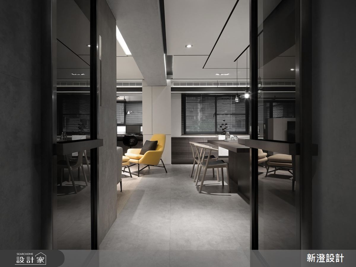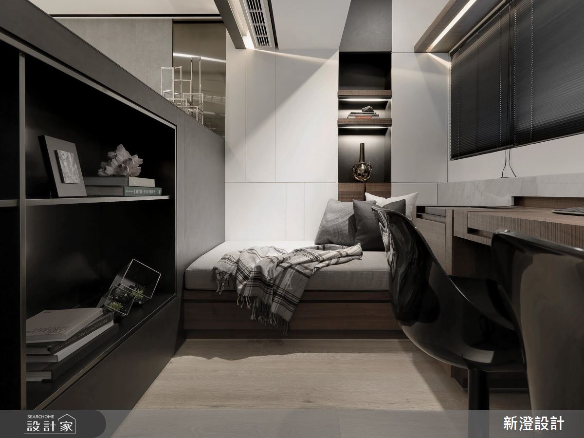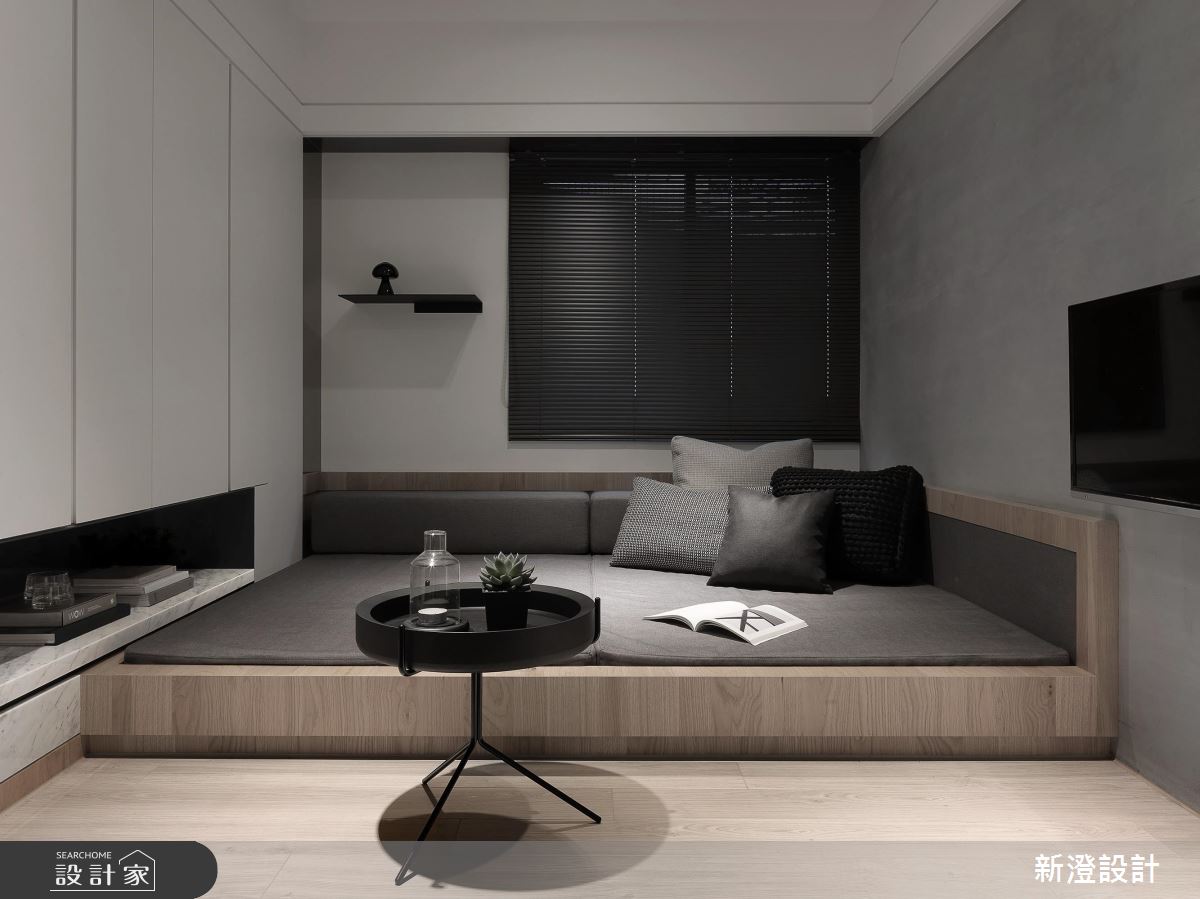 原先公領域格局狹小封閉,設計師以玻璃雙拉門打開玄關視野,將大坪數常見的內玄關概念運用於小公寓,與公領域達成無礙串連,接著以開放設計規劃客廳與餐廚空間,成功釋放視覺感受。由於老屋僅雙向開窗,有著光源不足的問題,需要大量人工照明輔助,包含投射燈取代直接光源、並在牆上加入延續至天花的光帶設計,同時達到實用照明與情境營造的需求。針對風格設計,選擇鈦金、大理石等冷調建材打造富有個性的灰階居家色彩,更別出心裁將不鏽鋼塑形後設計為電視櫃,並在電視牆後方巧妙納入半開放書房與臥榻,兼具歡聚與獨處空間。毛面鈦金玻璃劃分公、私領域的分界,接著利用多功能和室創造充裕的收納機能與休憩空間。