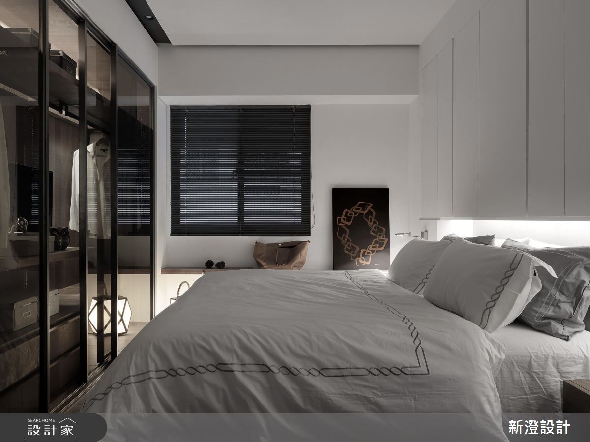 主臥回歸簡約純白色調,為了避免更衣間讓臥房看起來太多狹隘,利用灰玻拉門與燈光設計維持通透感。