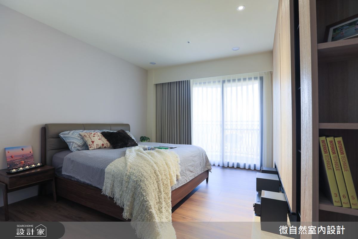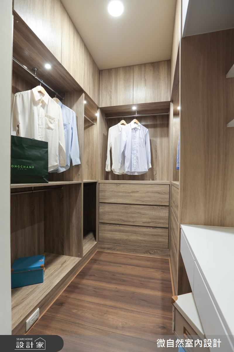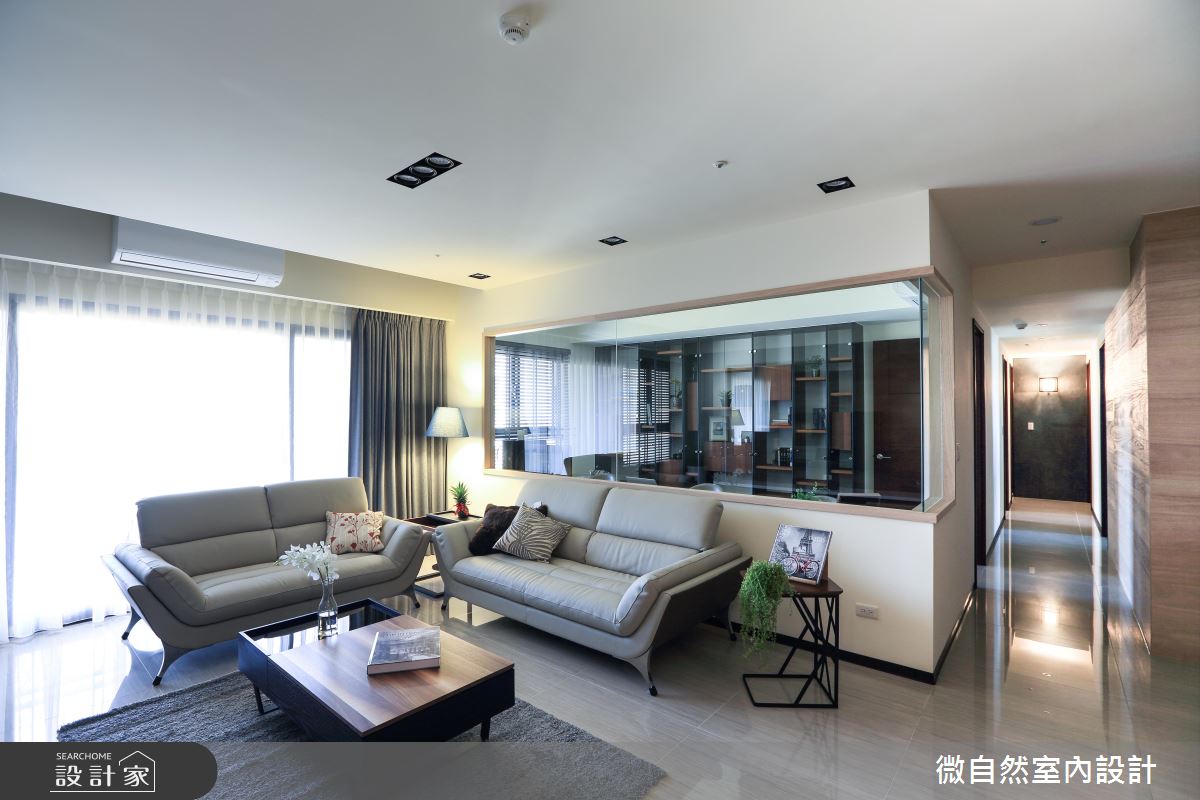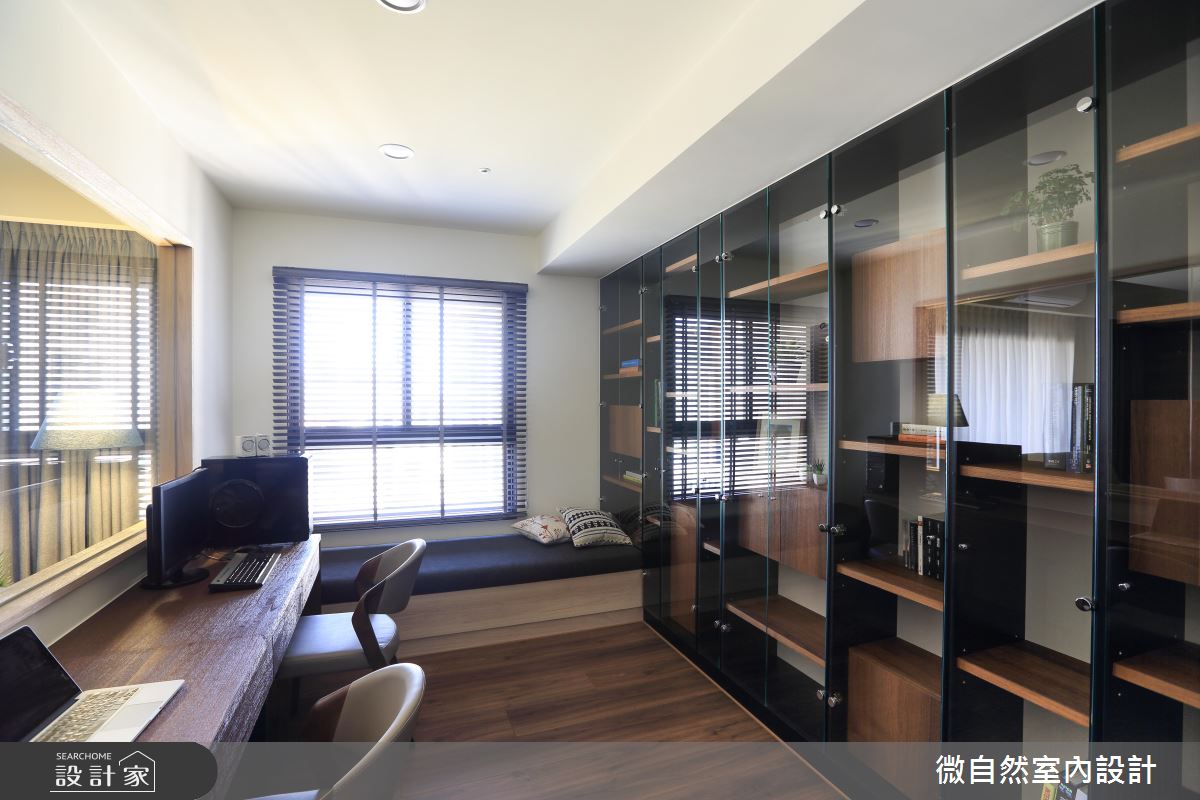 設計師首先在入門處加入收納機能,以大容量的實用櫃體滿足生活需求,並採以梧桐木貼皮鋪述玄關,搭配茶玻打造隔牆,營造若隱若現的通透視感,同時拆解既有廚房隔間,於餐廳、廚房之間配置玻璃拉門,客廳與書房之間也運用清玻連貫視線,型塑公領域敞闊無礙的空間感;材質使用上,則使用深色木地坪強調溫潤氛圍,電視主牆融入進口木紋磚疊砌,在交丁式的橫向拼貼之下,拓大立面的整體尺度,一側嵌入鐵件搭構懸吊展示櫃,呼應書房內的整面展示書牆,透過開放的展示機能美化居家表情;臥房則承襲溫暖木質肌理,除了規劃專屬更衣間外,更善用牆面的轉角與深度,適時融入置物空間,以無所不在的機能完善生活中的每一刻!