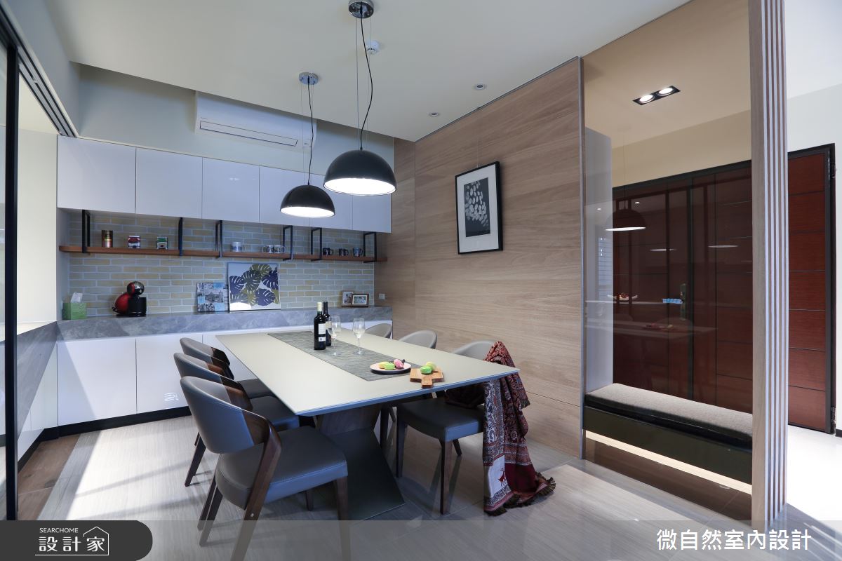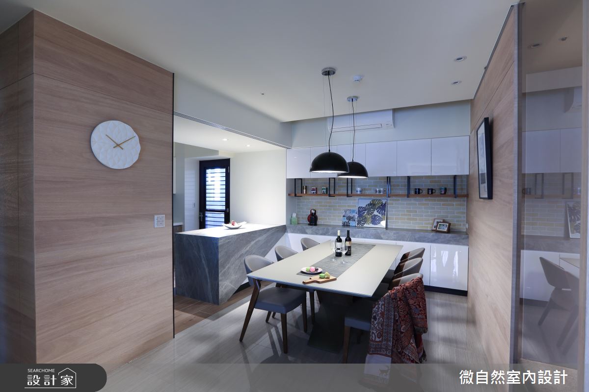 餐廳加入懸吊層架與展示平檯,選用灰色石材建構檯面,並讓石紋順勢延伸至一旁廚房吧檯,藉由色塊、線條豐富視覺感受,使餐廚地帶更具整體性!