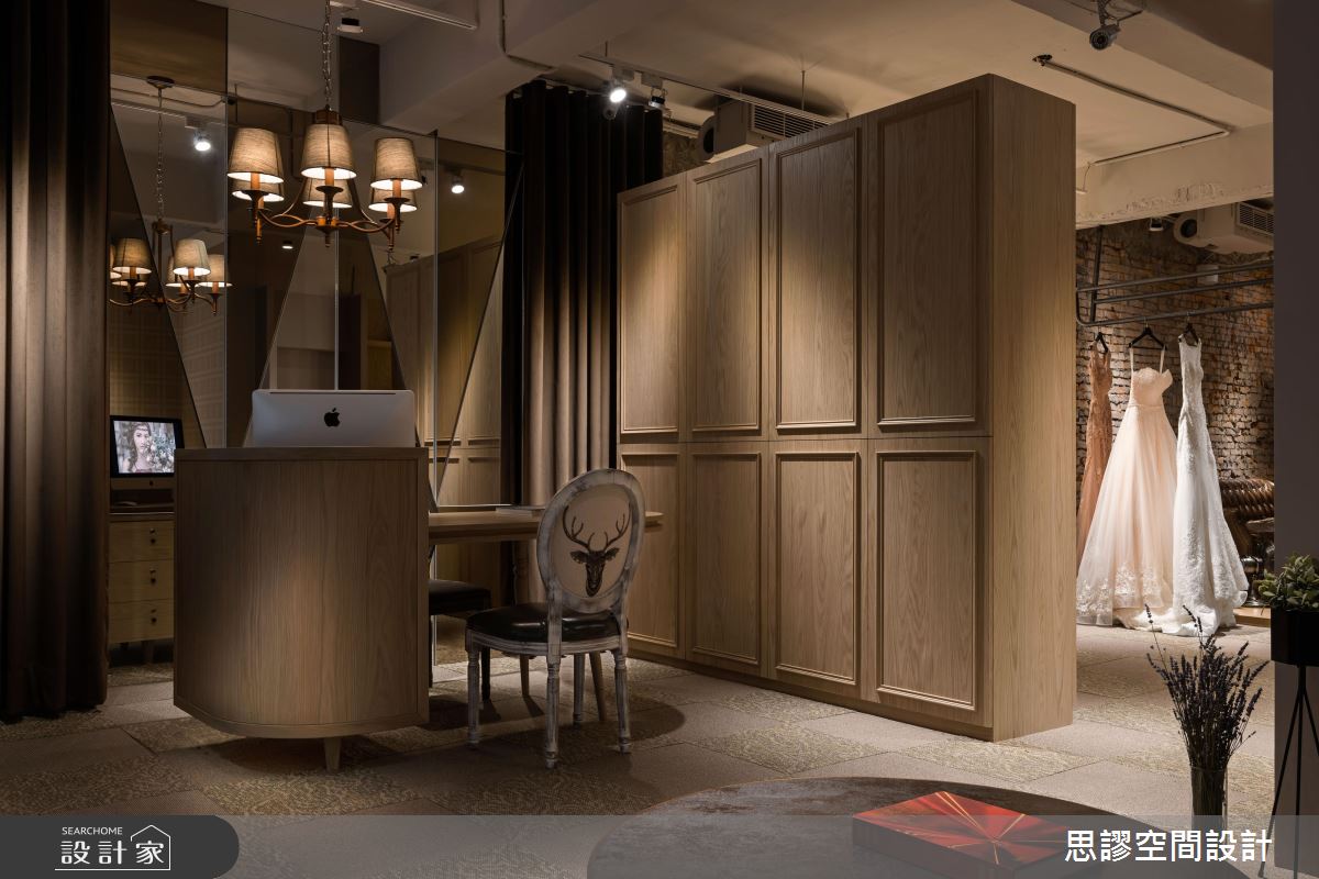 有鑑於空間作為攝影工作室,需要許多不同風格的背景,於是設計師運用場域之間的轉折,賦予多元化的氛圍,藉由漸進式的轉變,讓整體仍能自成脈絡,絲毫不覺衝突;從門面開始,即以清玻展示美麗婚紗,佐以光影烘托高雅低奢的場景,入口櫃台則加入圓弧曲面打造量體,緩解狹小的空間感,讓人不致覺得壓迫;針對地坪不平整的問題,則選擇架高地面、形成高低落差,並鋪設地毯掩飾缺點,同時透過不同材質的建材鋪陳,隱約界定每個領域的主題性,而面對難以處理的造型批土牆,更聰明地將牆面打掉且裸露紅磚,搭襯充滿古樸風情的軟件家具,營造出硬朗粗獷的工業風氣質,令人眼睛為之一亮!