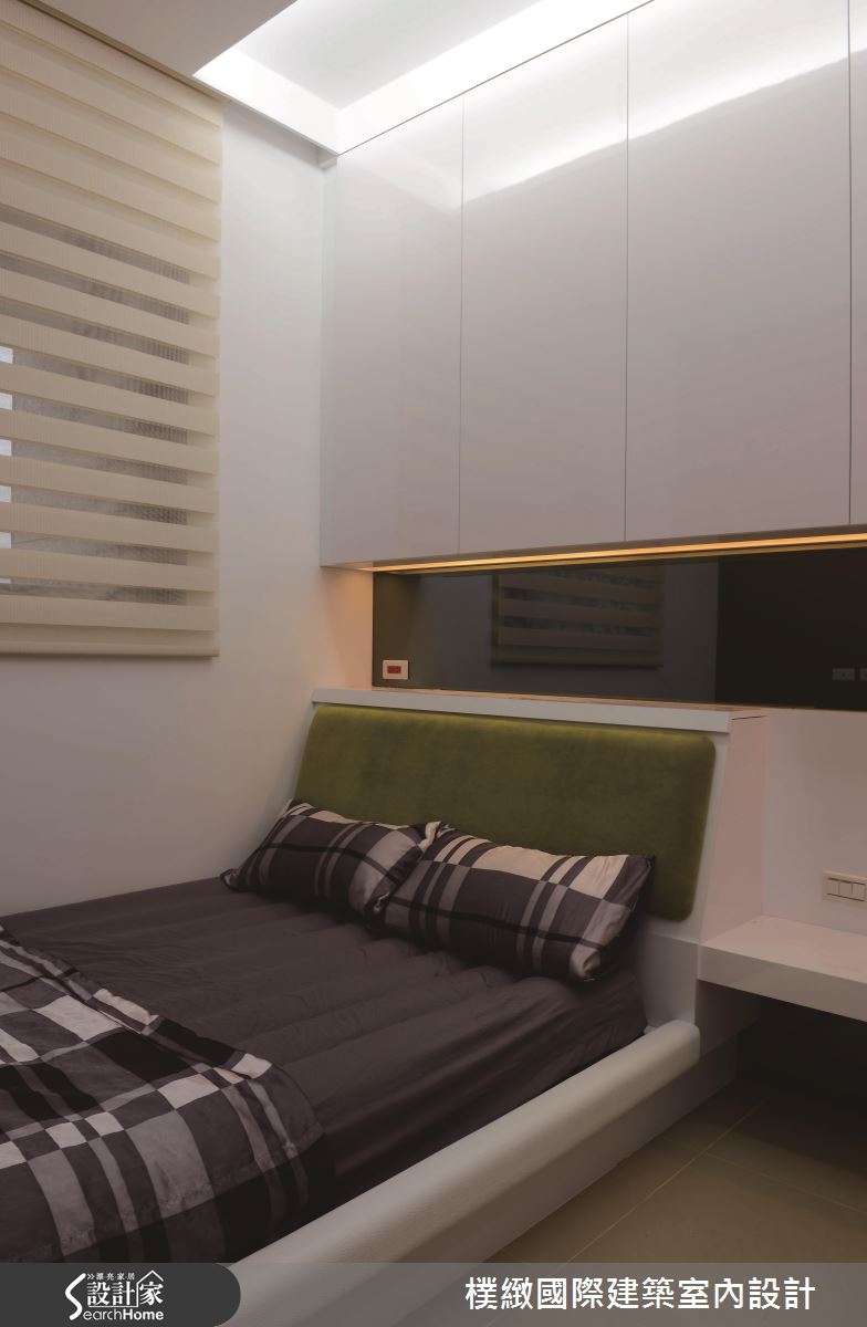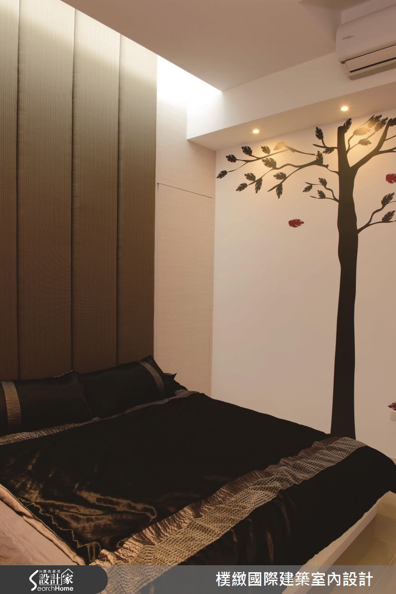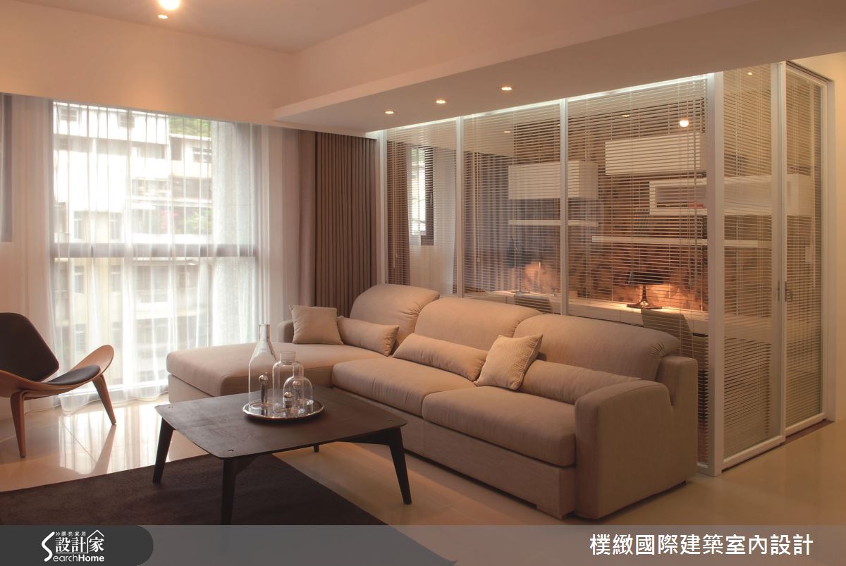 以白色調作為空間基底,充足照明的配置下,自然導引出流暢的行進動線;沙發上方遇包樑造型的天花板,搭配嵌燈設計,讓光源沒有死角,加上空間裡其他的照明安排,共同交織出明亮、溫馨的氛圍;伴隨暈黃的光源灑落,原木家具的擺設,以及咖啡色調的窗簾與地毯配搭,沉穩的大地色系妝點一室溫暖,融化冷冽白牆的視覺感受。將客臥間的牆面打開,客廳後方的書房以玻璃隔間,穿透的視覺效果讓公領域有放大之感,而書房裡的書牆設計上,利用幾何造型作為書架或展示空間,增添活潑與視覺趣味,同時也轉化為客廳的背景牆面;開放的餐廳領域,餐桌椅挑選原木質感,壁面則搭配線條感的風格畫作,挹注人文藝術之美。