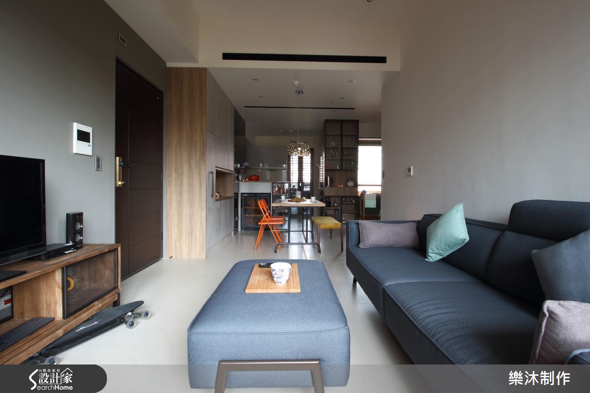 無隔間的隨興Loft Style,結合簡約的北歐質感,演繹出家的獨特表情;客廳的天花板保留原始的建築結構,挑高視線加上光源的映照,隨即呈現寬敞舒心之意;大門右側的收納櫃直到餐廚區,藉由裝修技法修飾大樑且降低天花高度,拉出領域的主次之別。深藍色調的沙發與茶几擺設,呼應屋主沉穩的性格,隨著綠、紫色系的抱枕配搭,挹注繽紛的視覺跳色;隨著色彩的躍動,視線也來到餐廳區,原木餐桌的上方飾以玻璃質感的燈飾,剔透光意的綻放,挹注一抹新意;空間裡填充大量的收納機能,無論是結合門片的收納形式,還是開放展示空間的樣貌,兼具美感與實用功能,同時界定出餐、廚領域。
