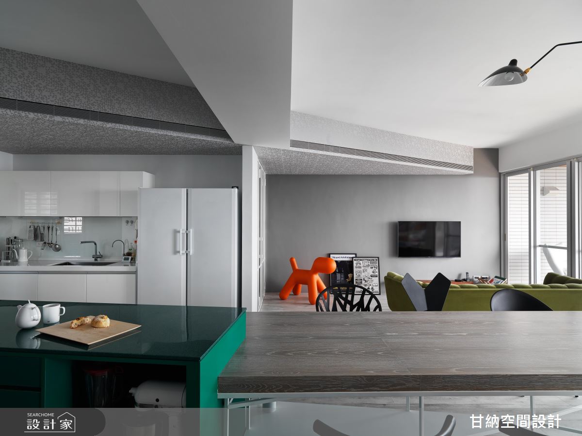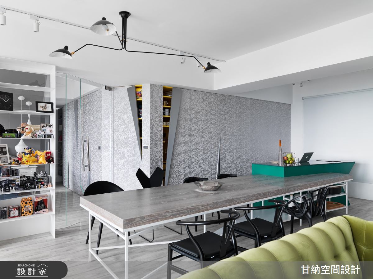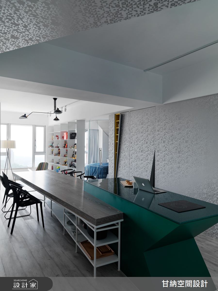 設計師透過開放的公領域思維,保有客廳、餐廳、廚房之間的互動關係,在天花板加入斜角結構,並以猶如折紙般的斜切元素裝飾櫃體,搭配光亮的灰色壁紙質地,網羅機能同時亦凝聚整體的創意美感;餐廳區則特別採用祖母綠的中島平檯,與客廳的芥末色沙發形成微妙呼應,搭配牆面黃色層板的妝點,襯出輕盈亮眼的色彩層次,而俐落有型、有如雕塑品的量體外觀,不僅充滿藝術感,更與餐桌串聯成更寬廣的使用平檯,拓大使用範圍;主臥房門則給予傾斜的出入口造型,並藉由略顯透空展示櫃作為客廳、主臥隔間,搭配上方陳列的收藏公仔,演繹生活中的創意趣味!