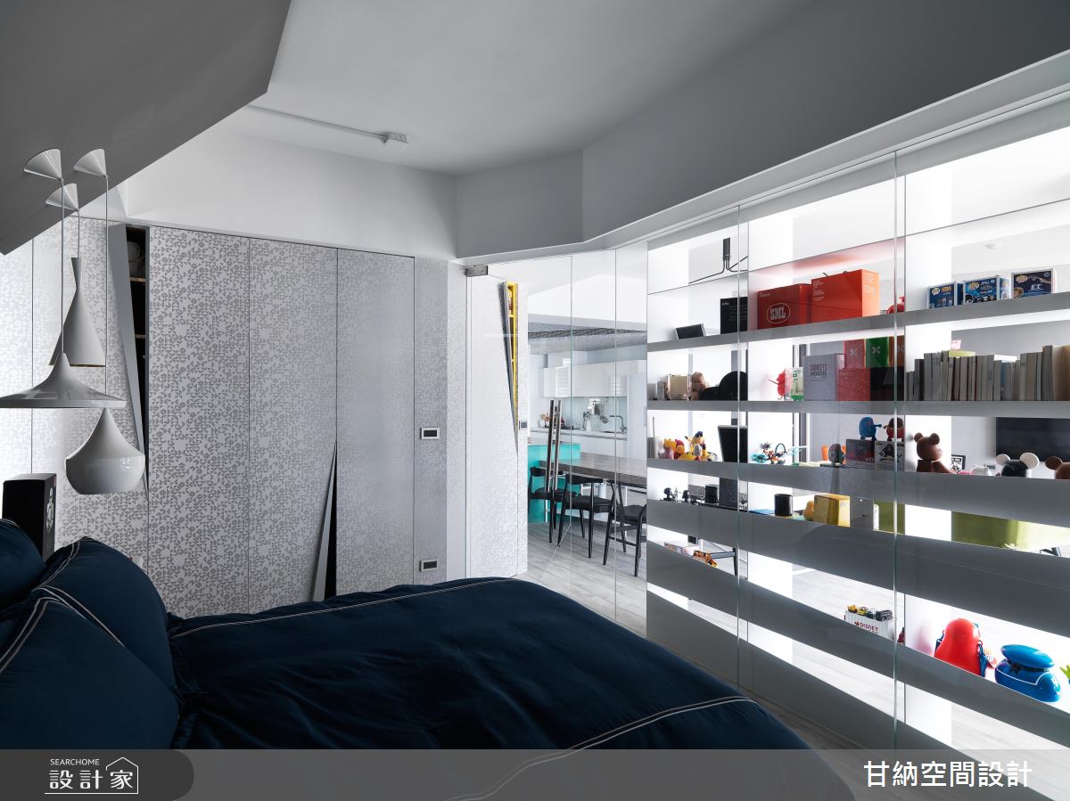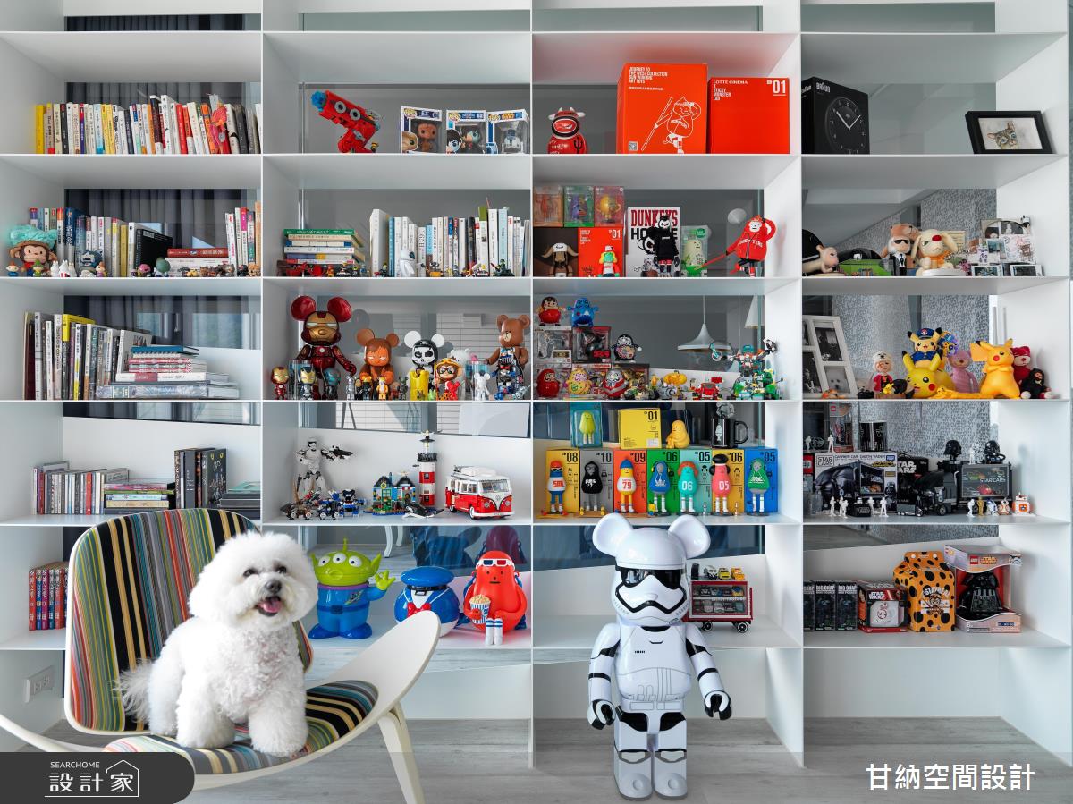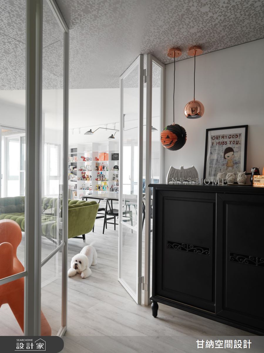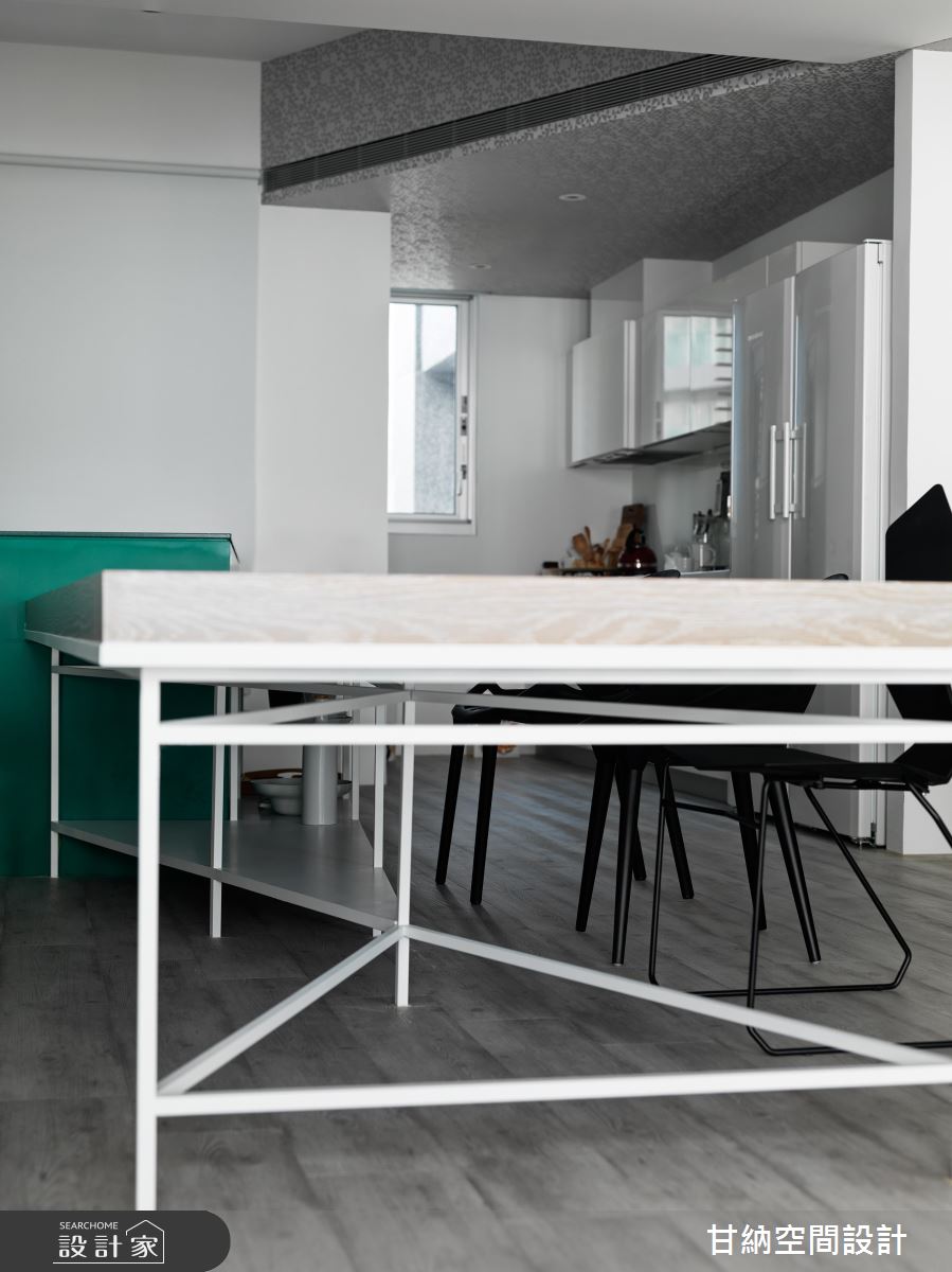 設計師透過開放的公領域思維,保有客廳、餐廳、廚房之間的互動關係,在天花板加入斜角結構,並以猶如折紙般的斜切元素裝飾櫃體,搭配光亮的灰色壁紙質地,網羅機能同時亦凝聚整體的創意美感;餐廳區則特別採用祖母綠的中島平檯,與客廳的芥末色沙發形成微妙呼應,搭配牆面黃色層板的妝點,襯出輕盈亮眼的色彩層次,而俐落有型、有如雕塑品的量體外觀,不僅充滿藝術感,更與餐桌串聯成更寬廣的使用平檯,拓大使用範圍;主臥房門則給予傾斜的出入口造型,並藉由略顯透空展示櫃作為客廳、主臥隔間,搭配上方陳列的收藏公仔,演繹生活中的創意趣味!