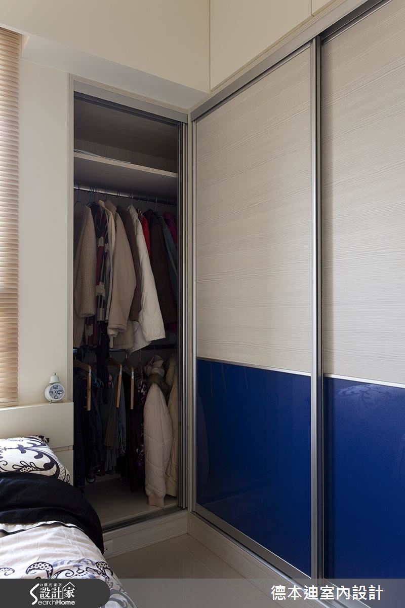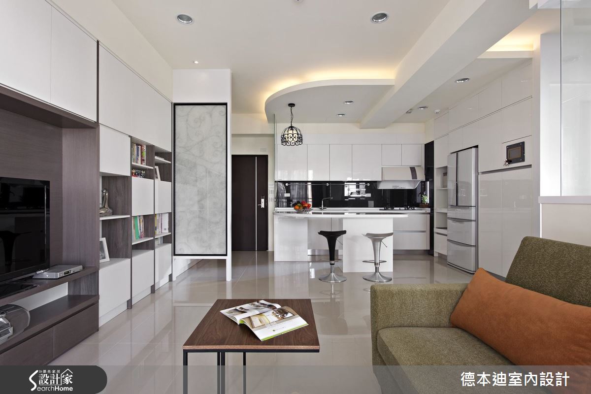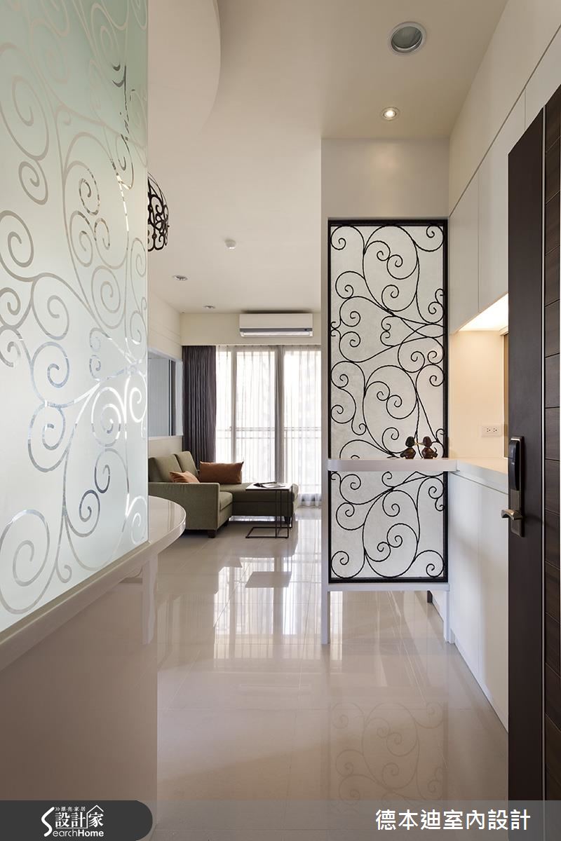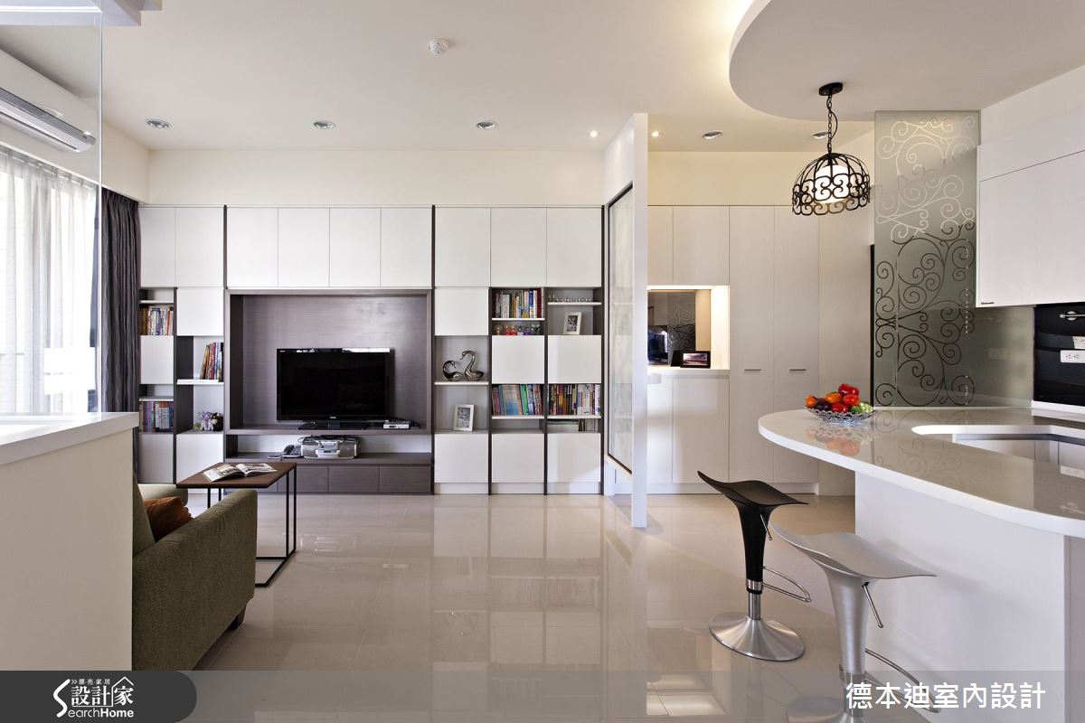為了阻絕開門見窗的視線問題,設計師配置鐵件及噴砂玻璃隔屏,一旁也採以相同圖騰語彙、噴砂玻璃裝飾牆面;客廳內,則藉由電視立面的延伸,創造加乘的空間感,藉由展示與封閉的穿插設計,將豐富收納機能蘊含在其內,交織出豐富的牆面風貌;餐廳則巧妙於天花板加入圓弧線條,呼應下方吧檯的圓弧造型,規劃出可品酒用餐的放鬆場合,以 L 型的格局收納廚具設備,完善利用每吋空間;寢臥內收掉多餘贅飾,呈現簡約無壓的氛圍,腰線以下則透過藍色揮灑,帶出視覺多變性,並整合容量超大的衣櫃空間,滿足屋主生活所需!