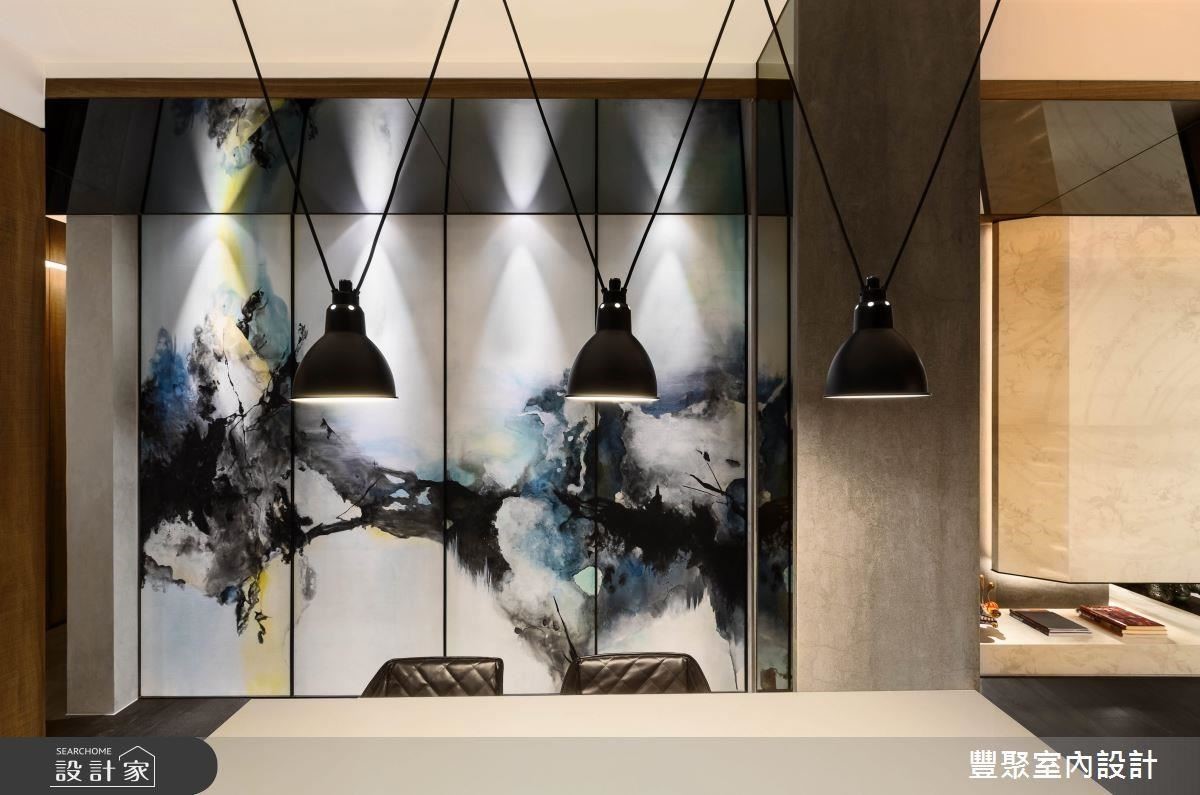 開放的廚房中島區旁有一道與長親房之間的過道牆面,既是一面牆,也是長親房的隱藏門。請來畫家為此面牆演繹一幅山水畫,運用相似的色調,展演獨一無二的藝術美學,以藝術串聯客、餐廳空間,勾勒和諧的視覺感受。天花板利用鏡面反射光影,突顯山水之間遠近的層次感,巧妙地成為視覺焦點。