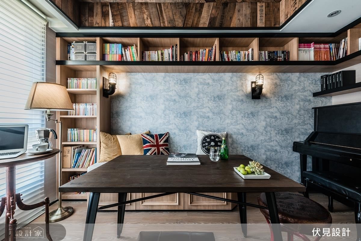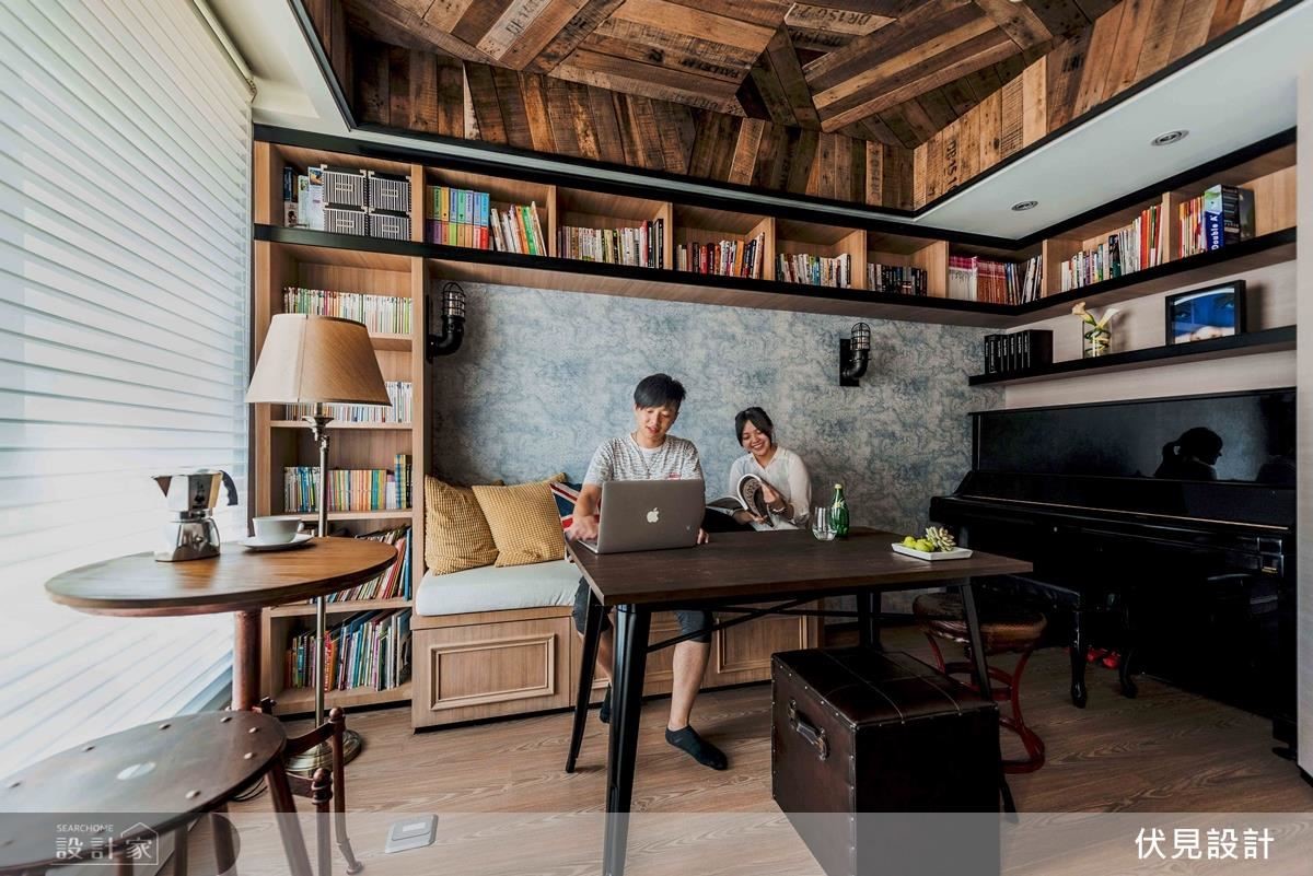 屋主藏書極多,而且興趣廣泛,這個閱讀區以回收木料營造小木屋式的天花板,三面都是書櫃,更在鋼琴上方設計琴譜層架,一旁還有男主人的相機防潮箱。舒適的坐榻下方也是收納,讓一家可以或坐或臥,沉浸在被書海琴音環抱的幸福感。