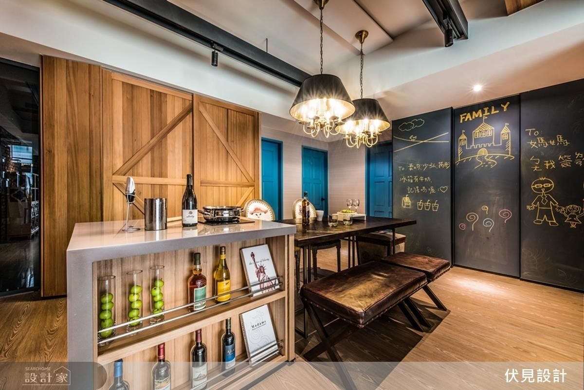 穀倉門片裡是家中較大的收納空間,一側是料理吧檯,一側則是層板式的收納櫃;餐廳以中島銜接大餐桌,下方還嵌入烤箱,成為親子可以一起下廚的快樂天地。黑板牆則是家人互動的好工具,貼心叮嚀的話語,是充滿生活感的溫馨畫面。