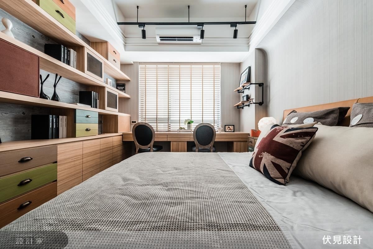 小孩房則有多元設計的櫃體,書桌衣櫃書櫃一應俱全。兩個女孩同房,牆面是活潑跳色,實虛穿插的櫃體,無論是書或小飾物,都能分門別類擺放,封閉櫃面打開還有女生最必備的鏡子;男生房的設計也類似,設計師更為他們裝設烤漆玻璃,隨時寫下備忘錄,實用又貼心。