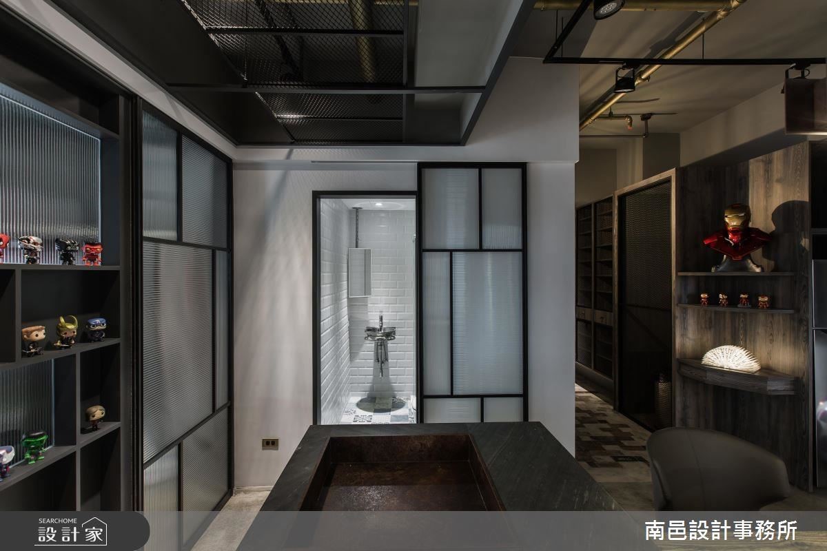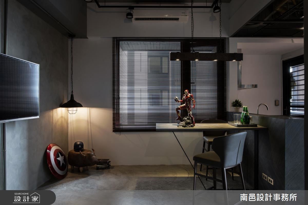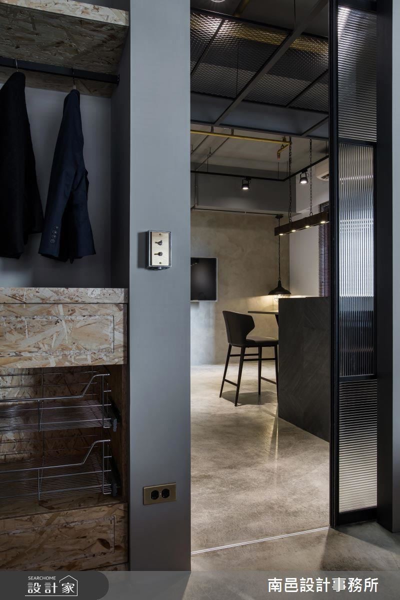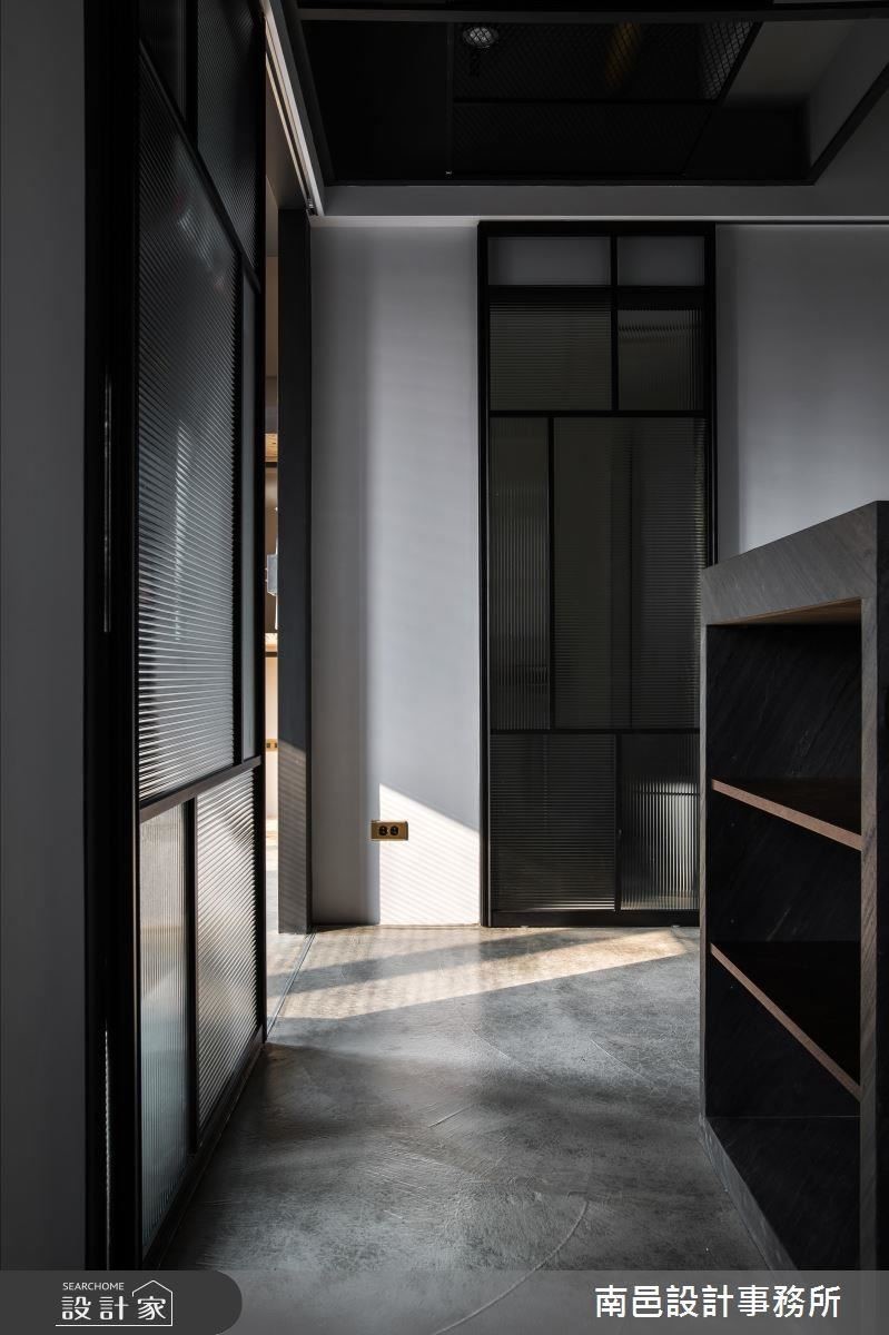 南邑設計團隊進一步談到,屋主規劃時就期盼空間是以工業風為定調,為了表現出風格本身的況味,設計團隊使用了不同材質來做表述,看似深沉穩重,但隨質地本身又再替空間營造出質感。玄關開始便是以帶點粗獷質感的地磚來做引領,進入到客廳則是以水泥粉光為主軸,自身材質的色澤與效果,成功地襯托出空間風格的主軸調性。在整個公共區域中也可以看到,設計者除了使用鐵件、沖孔金屬板、長虹玻璃等,加強風格氛圍中剛硬、俐落味道之餘,也善加運用燈光照明,替空間注入點慵懶迷人味道,氛圍效果亦提升了不少。