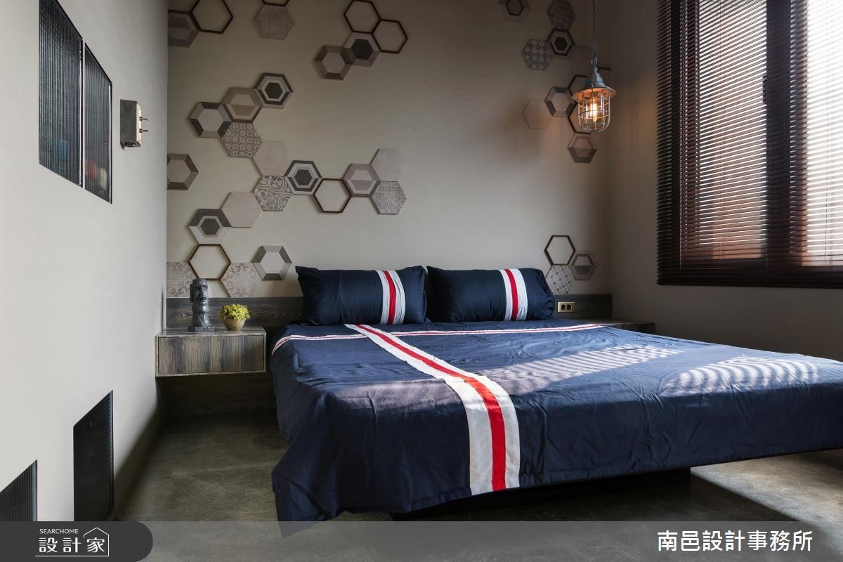 至於在臥房部分,在不偏離風格核心下,牆面上以六角方塊磚、黑鐵做勾勒,不規則的排法,與工業風格不違和,同時又能增添牆面的豐富性與立體度。由於主臥坪數不大,在為了能放入雙人床的情況下,設計師以鐵件製作床架並將其內縮,形成好似飄浮的感覺,滿足機能同時又不會感到壓迫。