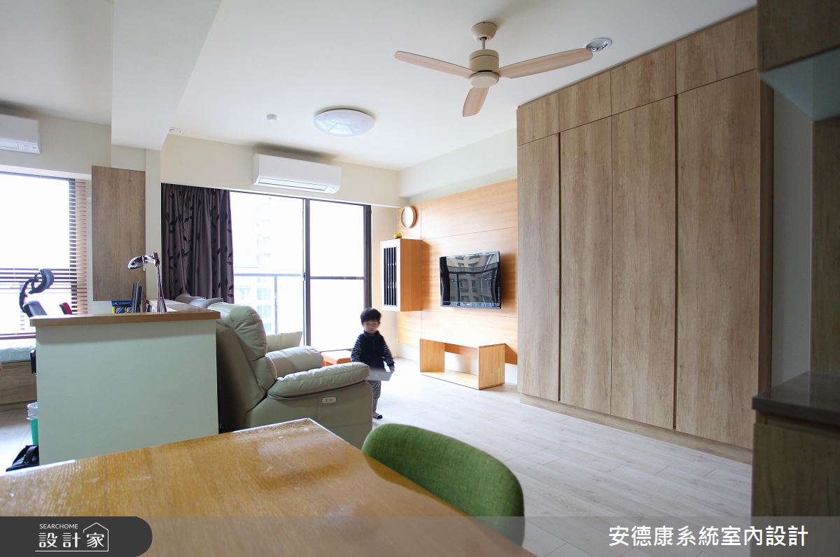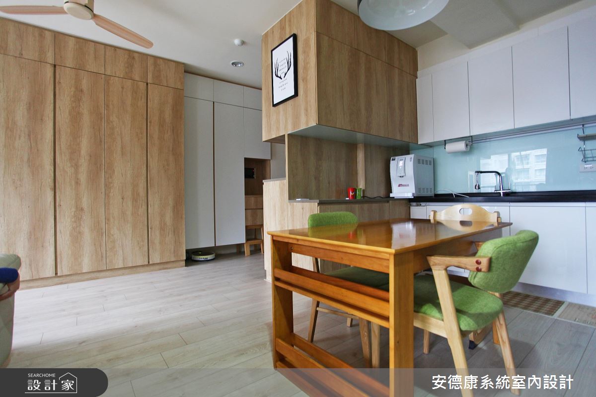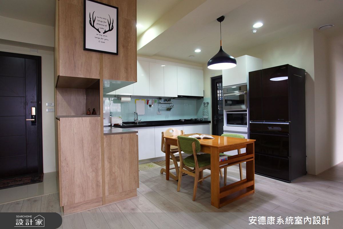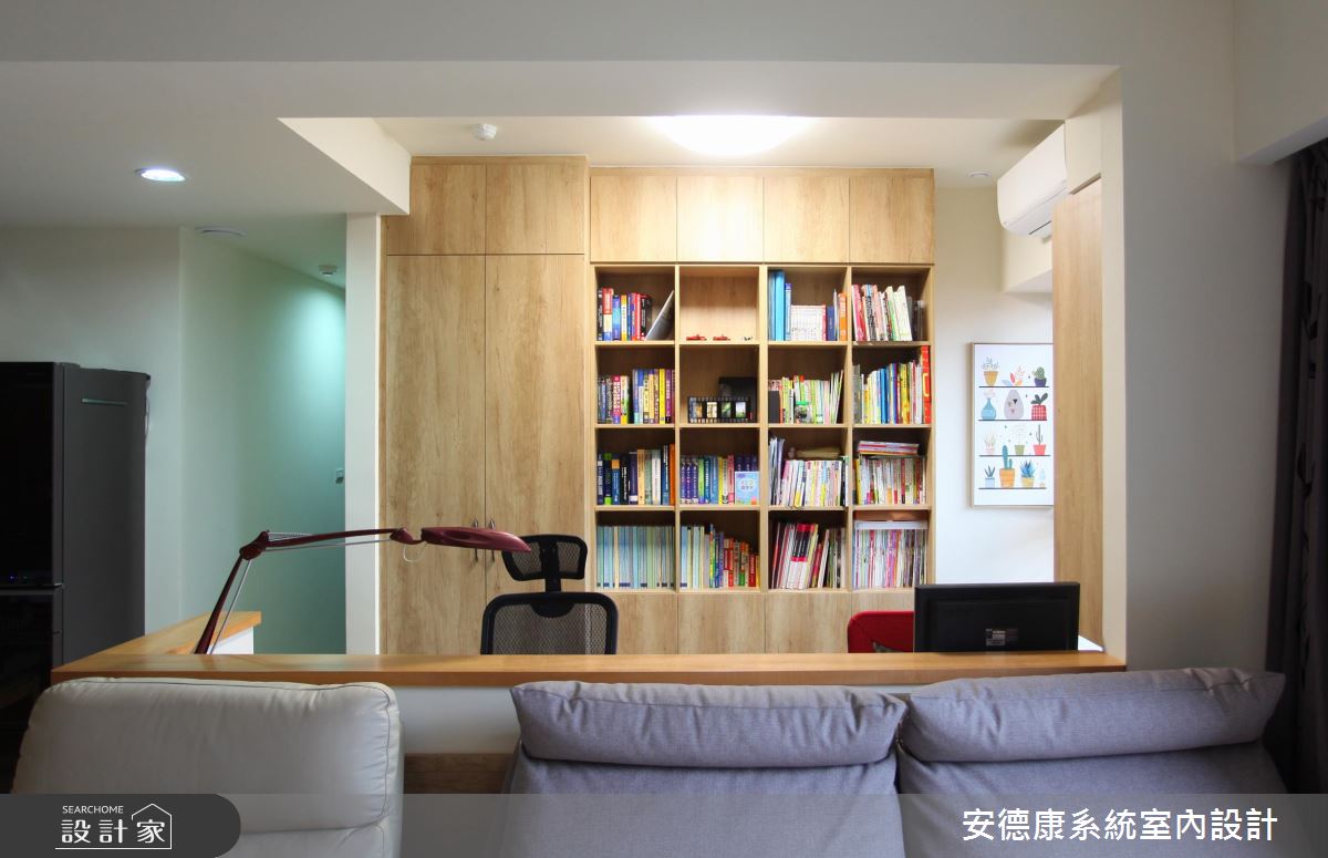 玄關兩側擺設收納櫃讓入口更顯集中,藉此將內外領域清楚劃分,讓餐廚空間與玄關有效區隔;進入公領域,視野隨之明亮而遼闊,客、餐廳與書房相融一室,開放的格局配置,讓居家生活更顯舒心愜意;整體空間以木地板舖陳,系統櫃成為空間的主要收納,電視牆以溫潤的原木質感打造,與空間裡不同色澤的木紋相互配搭,創造漸層的視覺美感;電視牆的左側搭佐懸空的電視櫃,打破傳統的設計手法,格柵的視覺造型,避免將櫃內的電線配置一覽無遺;沙發後方為書房領域,系統櫃創造開放式書櫃牆,窗邊再搭配臥榻設計,提供一處休憩的悠閒時光。