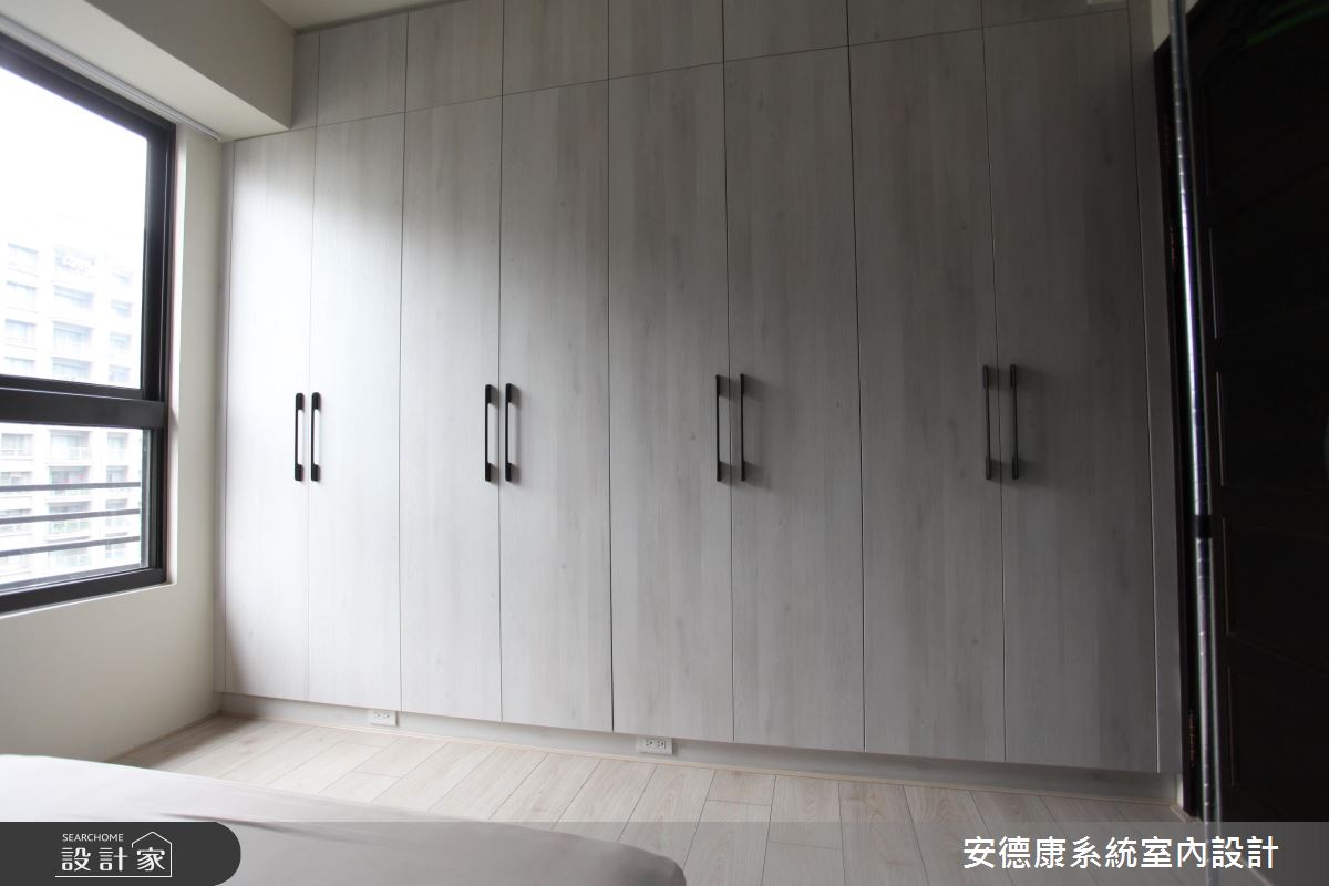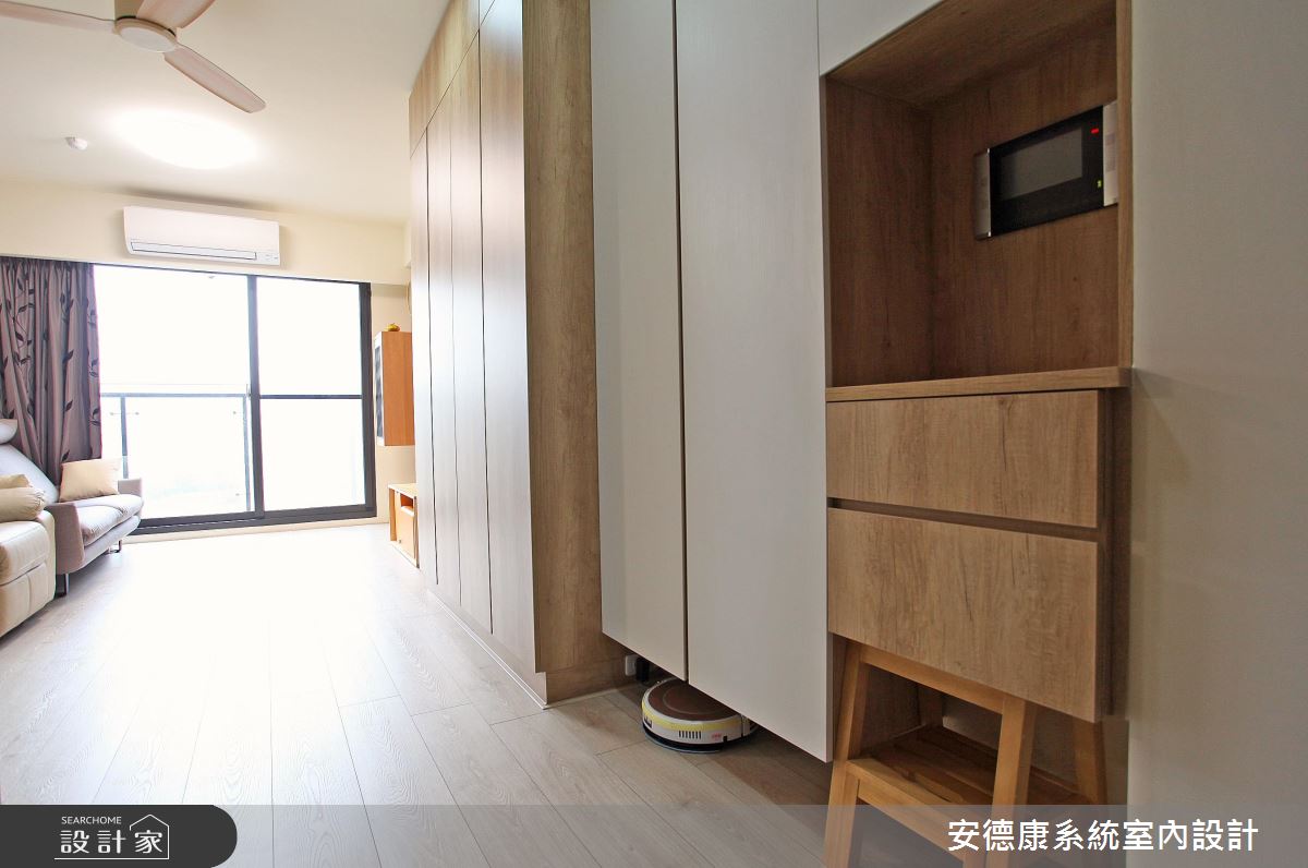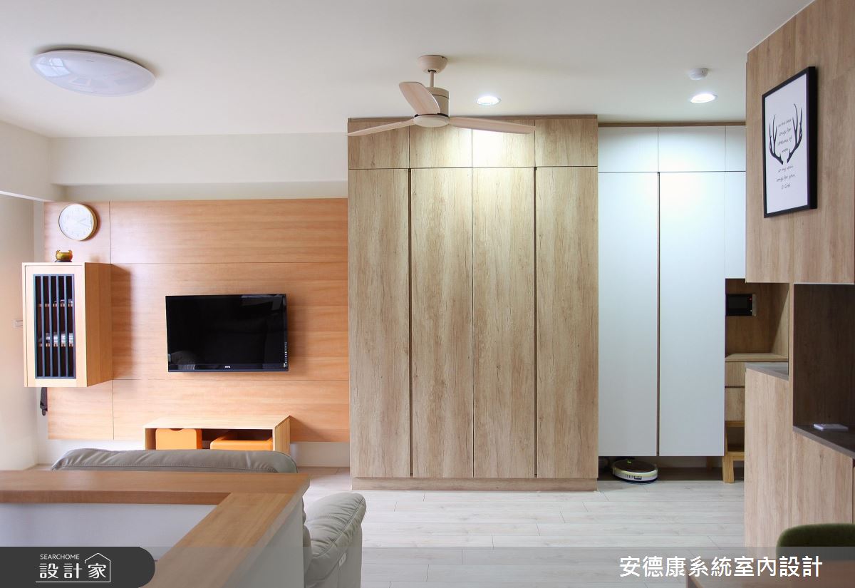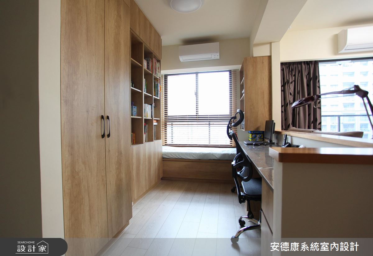 玄關兩側擺設收納櫃讓入口更顯集中,藉此將內外領域清楚劃分,讓餐廚空間與玄關有效區隔;進入公領域,視野隨之明亮而遼闊,客、餐廳與書房相融一室,開放的格局配置,讓居家生活更顯舒心愜意;整體空間以木地板舖陳,系統櫃成為空間的主要收納,電視牆以溫潤的原木質感打造,與空間裡不同色澤的木紋相互配搭,創造漸層的視覺美感;電視牆的左側搭佐懸空的電視櫃,打破傳統的設計手法,格柵的視覺造型,避免將櫃內的電線配置一覽無遺;沙發後方為書房領域,系統櫃創造開放式書櫃牆,窗邊再搭配臥榻設計,提供一處休憩的悠閒時光。