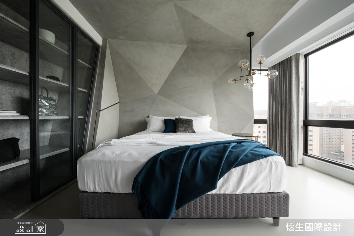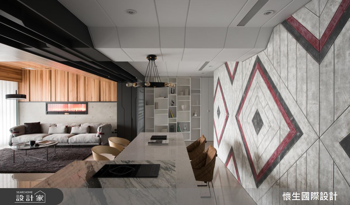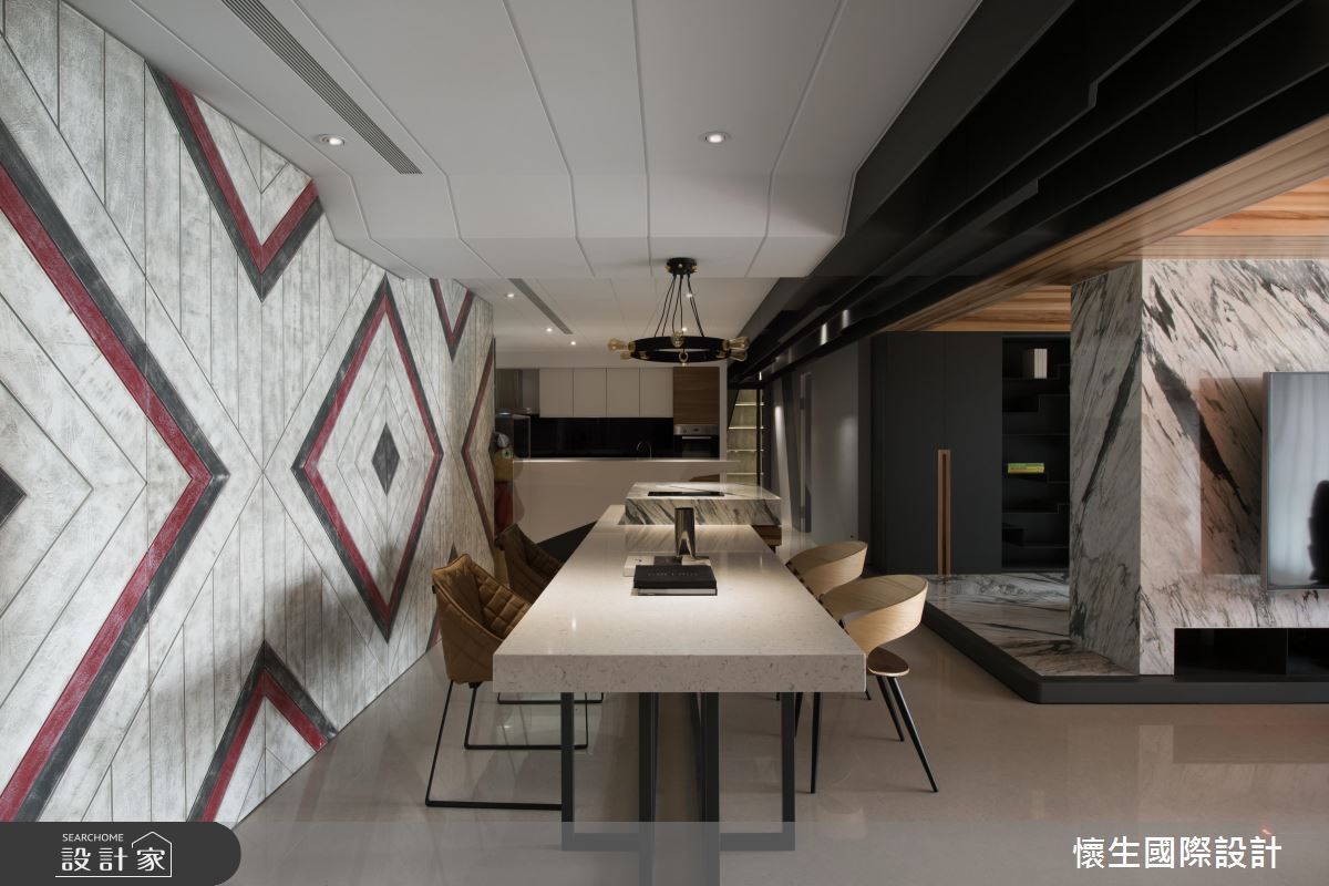 採開放式設計的公共空間,融合客廳、餐廚和書房空間,不只讓格局在視覺上變得更大,居住者也能更靈活地使用各種空間機能。沙發背牆運用仿清水模漆,拼接大甘木、大理石的鮮明紋理,營造出衝突又和諧的美感。餐廳收納櫃體的門片,特別運用仿舊漆和手工壓紋處理,透過獨特的造型和紅色,凸顯個性感,而大理石電視牆向後方書房的地坪延伸,抬高了地面高度,使閱讀空間具有自成一格的獨立性,搭配充足的開放式櫃體,可容納書籍和不同大小物品的收納展示。臥室融入多元的收納機能,並運用灰質色調回歸自然簡約氛圍,床頭背牆的立體幾何切面造型,也讓這處私領域空間顯得非常前衛和與眾不同。