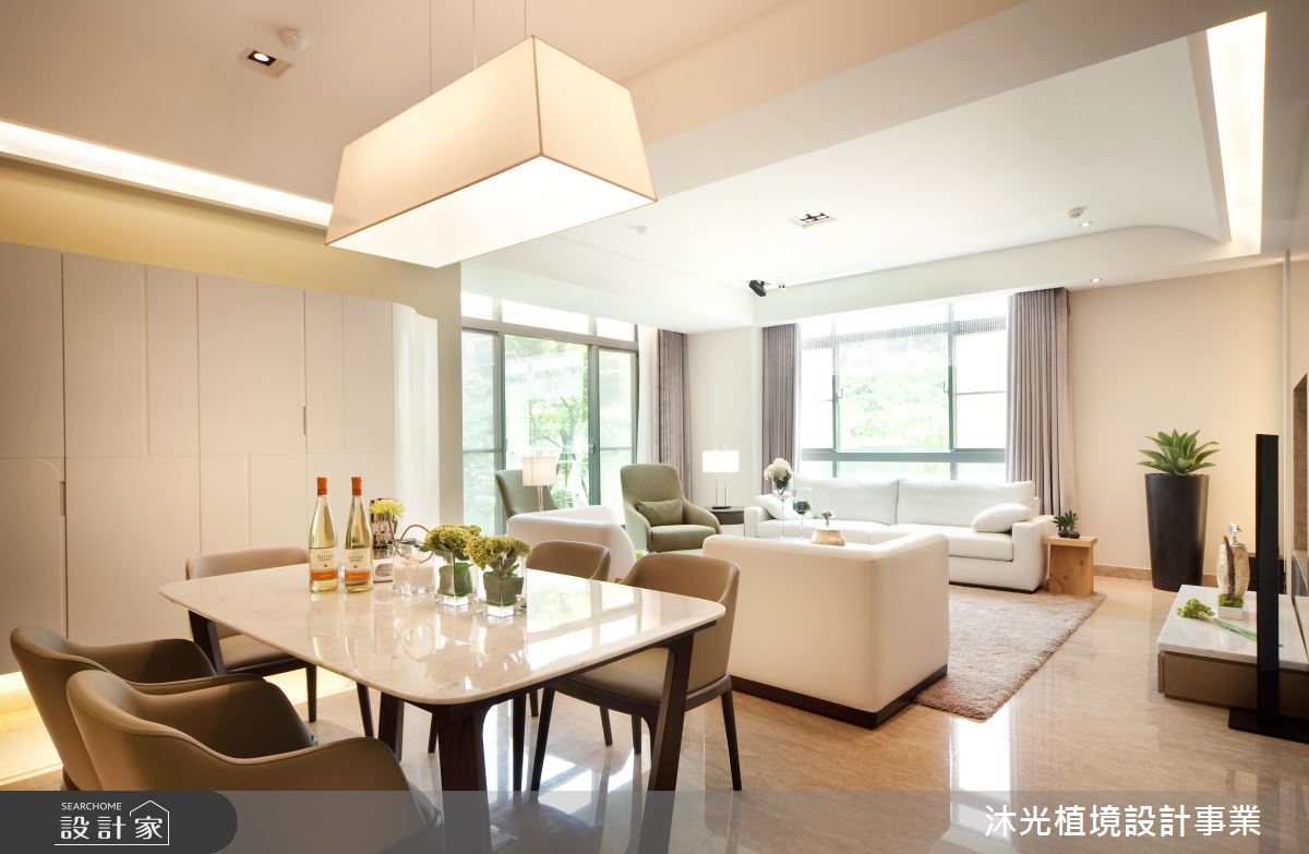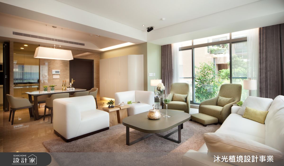 明亮、開放的設計手法形塑整體公領域氛圍,白色的結構天花板,搭佐淡雅的家具色系,加上敞開的落地窗引入戶外綠意,內外皆景,調和透亮、流動的生命氣息。