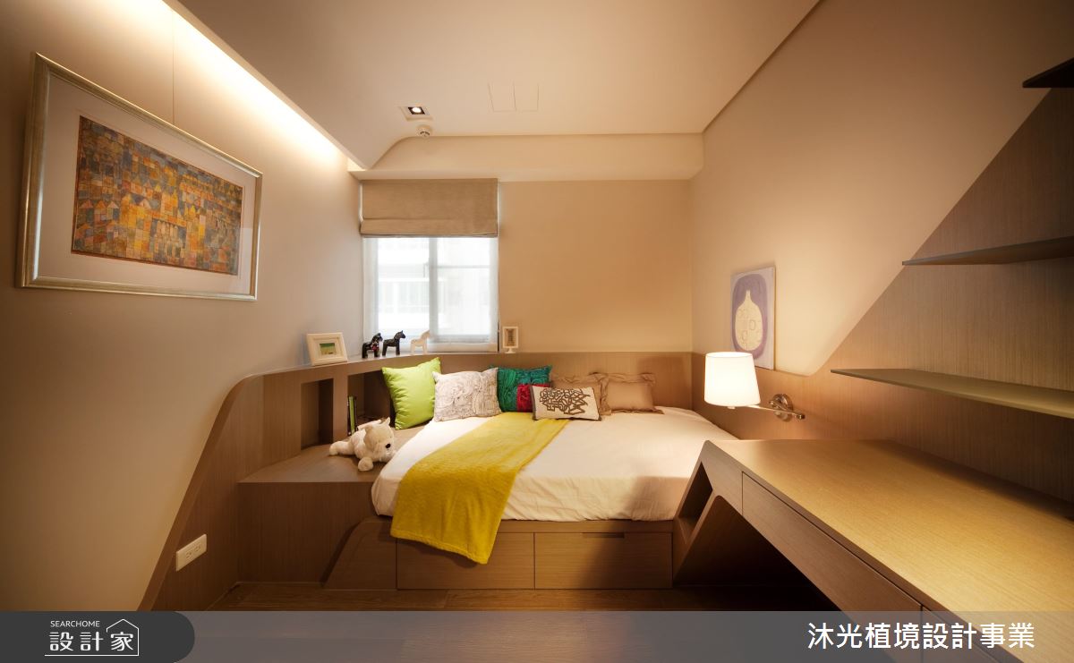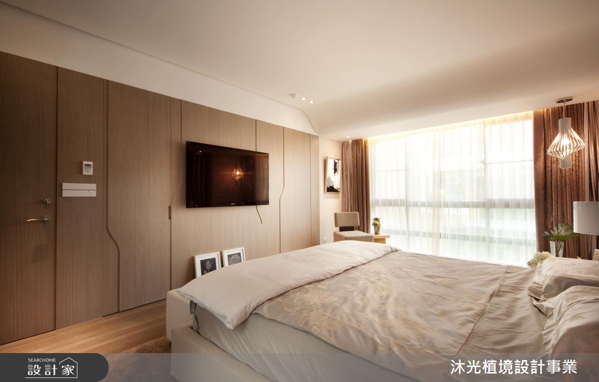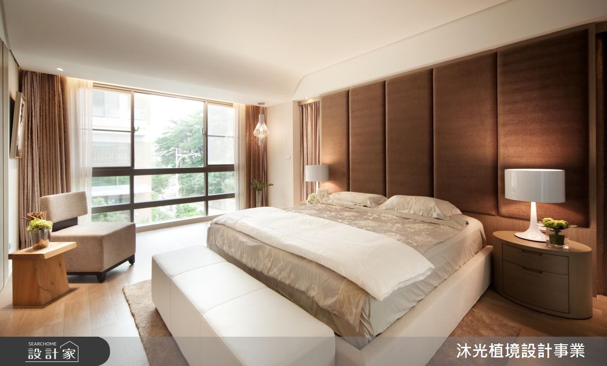 主臥設計以女屋主的想法出發,床頭以繃布鋪陳,挹注些許華麗感,另外加強收納機能,且另設獨立化妝室,滿足屋主日常所需。