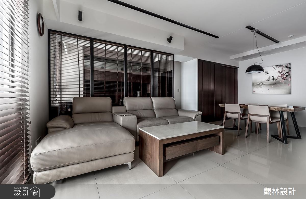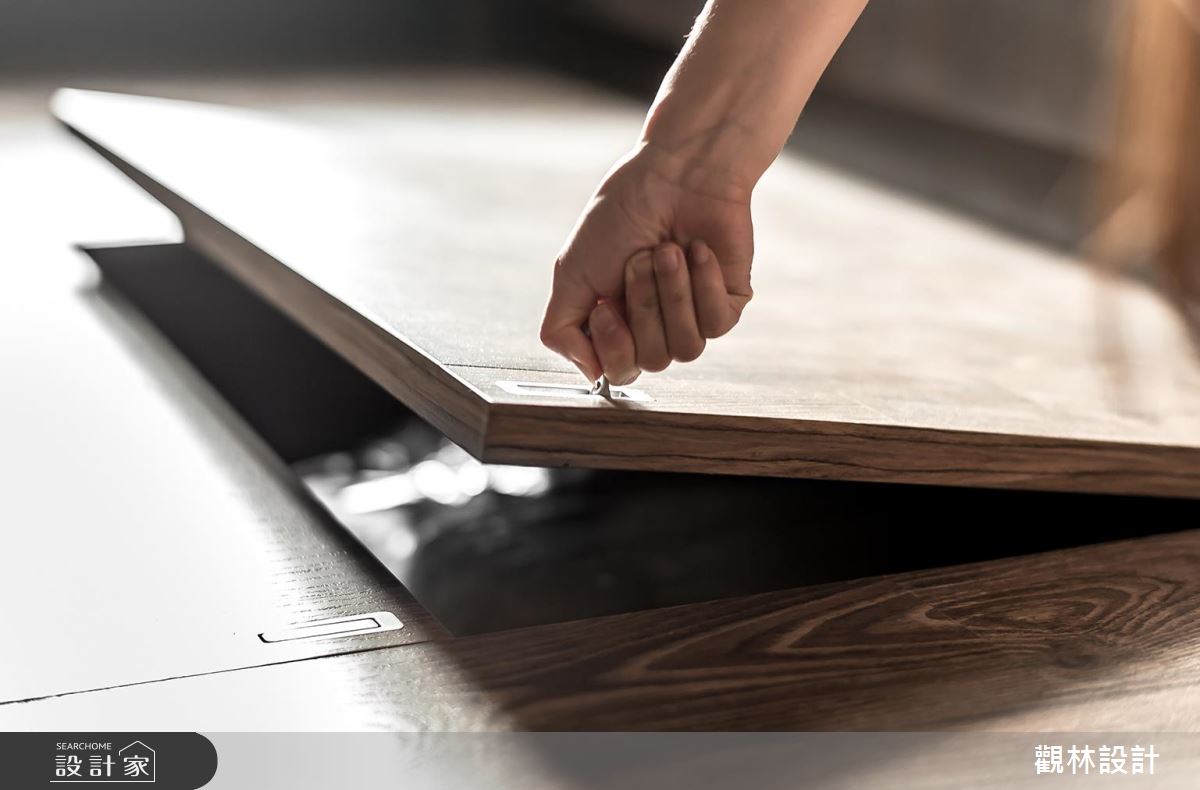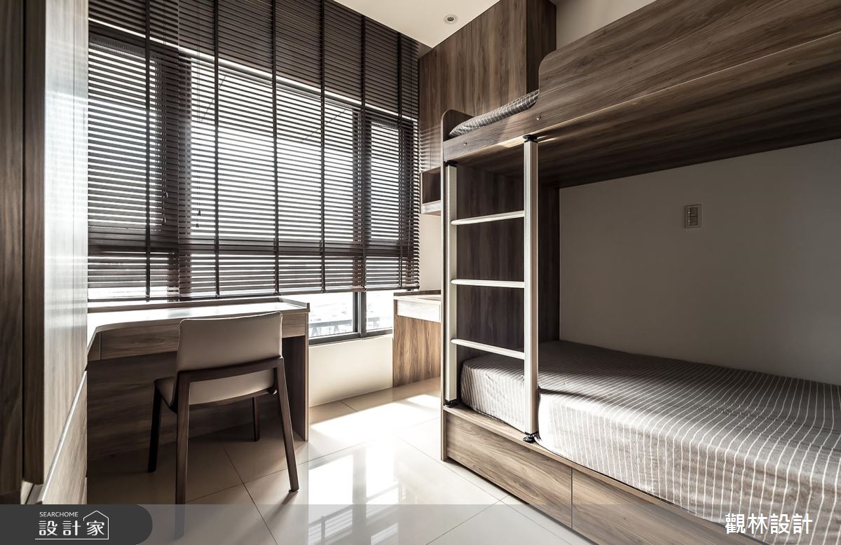 廳區主牆運用深色木皮加以鋪陳,串起玄關鞋櫃與電視牆櫃體,挹注豐富的收納機能,中段則置放大型瓷器聚焦視覺,點出場域的設計亮點,再藉由木質百葉簾導入美好光影,陳列灰階與象牙色的素樸家具,譜出恬淡柔和的氛圍;沙發後方被規劃為書房場域,以清玻串接視線,衍生通透放大的空間感,書房內則架高木地板,地面做出上掀式櫃面,透過隱藏式的聰明規劃,落實清爽不雜亂的收納型式;私領域延續簡約的質地,採用深色系的木質系統櫃,一併打造床架、書櫃與衣櫃等,並加入一體成型的上下鋪設計,發揮寢臥內的每一吋可用坪效!