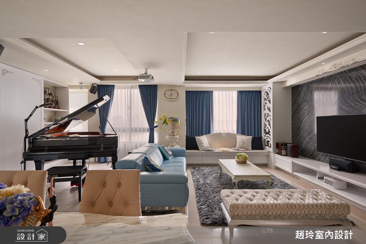 居宅捨棄繁複語彙,引用簡約的線板元素,闡述清新典雅的新古典氣質,電視主牆則推翻常見的灰色或白色,選用少見的黑雲石,透過深色剛硬的紋理,凝聚強烈的視覺印象,並適度地添入藍色,從窗簾、沙發、地毯等處著手,帶入蔚藍海洋般的氣息;值得一提的是,由於屋主有一架鋼琴,於是精算了場域之間的距離,除了更動牆面位置,也刻意架高地坪,讓鋼琴擺放位置形同一處居家表演台;而天花格局則保留部分,維持原先就有的餐廳水晶吊燈,運用燈光、邊框、造型等包覆飾邊,揉入弧型的延伸,導引視覺的動線;一旁廚房則呈開放規劃,在既有設備之下,添入新的櫃體與面板,並增設一道吧檯,創造出全新的料理區塊;寢臥區,為了營造出峇里島的度假感,色彩上以灰色貫穿主軸,且在舊衣櫥融入新裝飾,重塑新穎的櫃面表情,開啟舊家具的新利用價值!