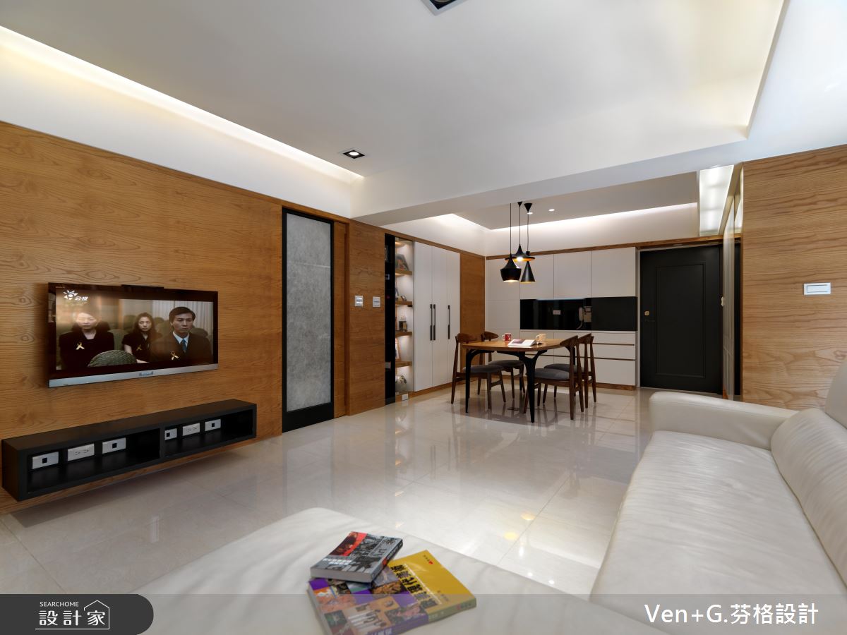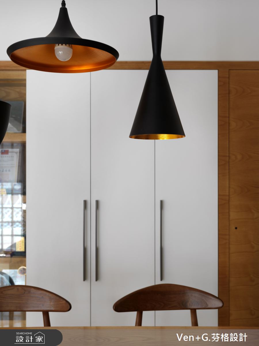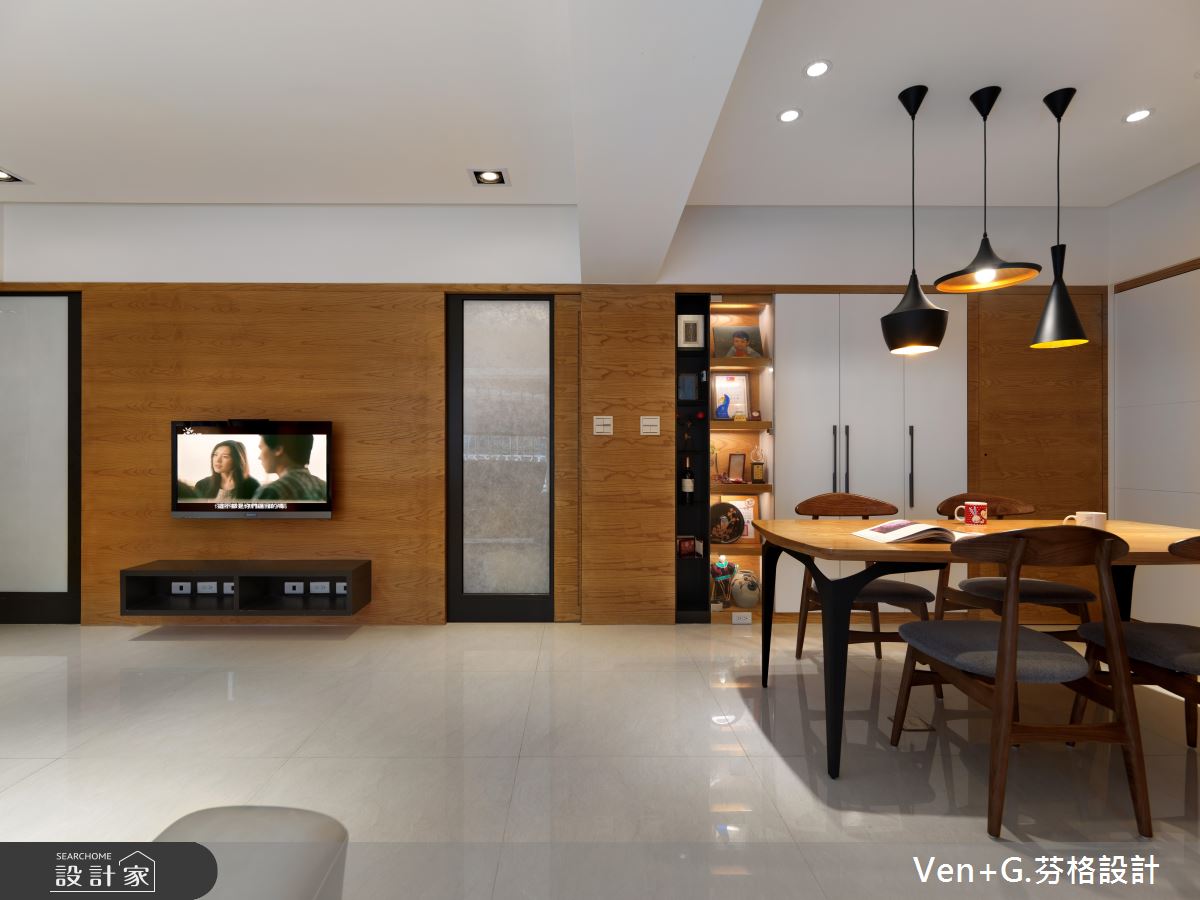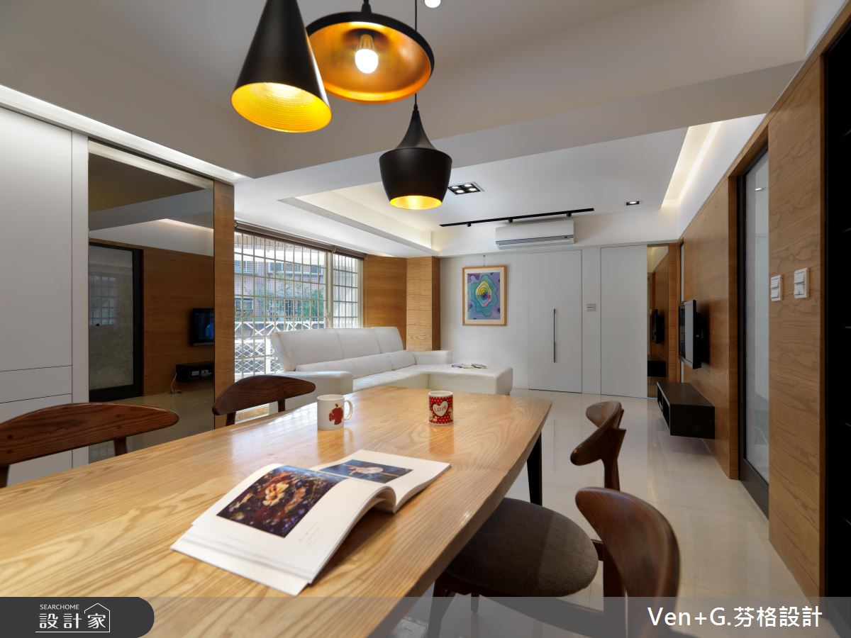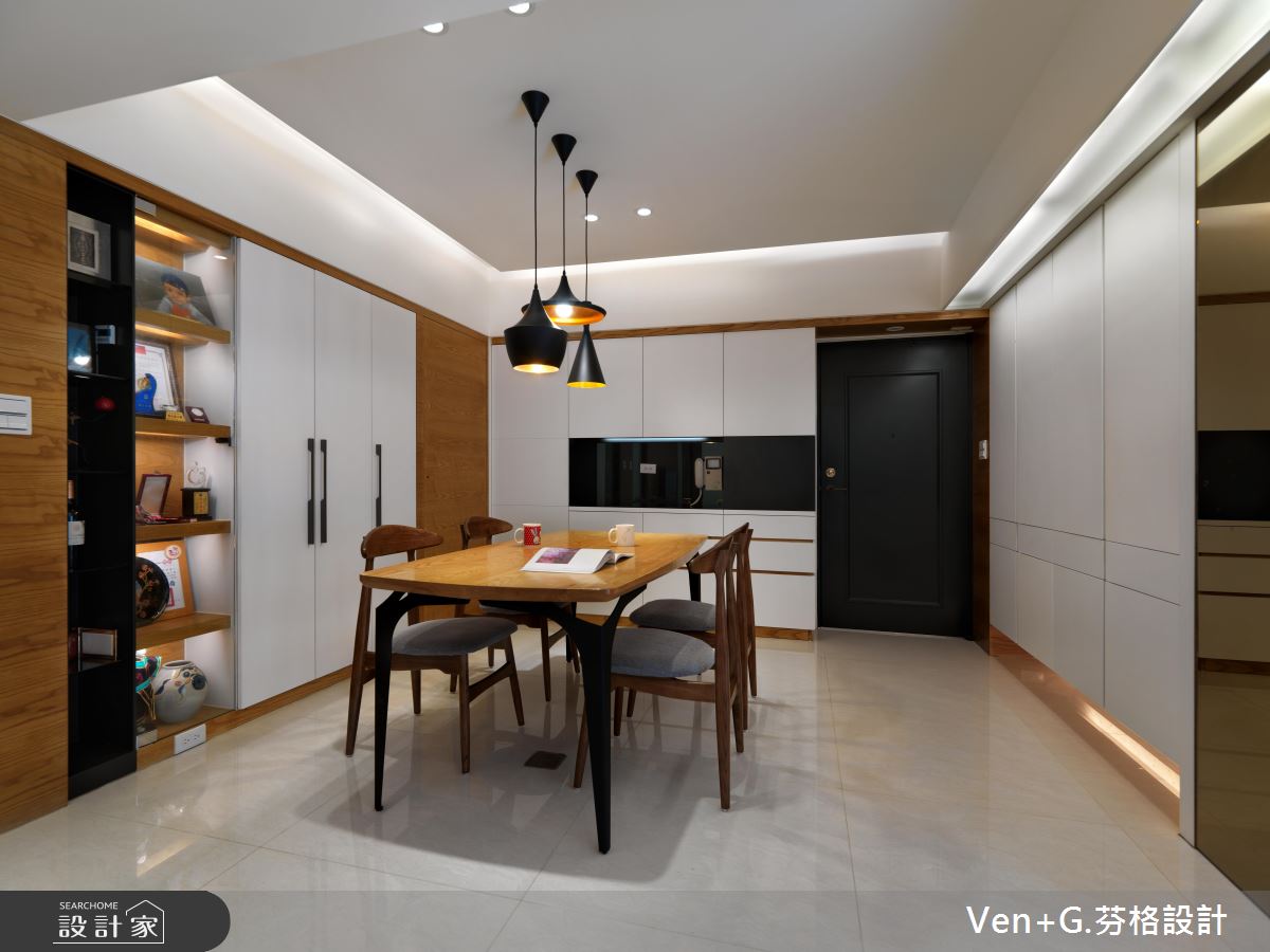 天花板以高低落差勾勒出視覺層次,同時美化樑柱結構;潔淨的白作為空間基調,局部藉由木紋肌理的鋪陳,替雅致的室內氛圍挹注溫潤情感,再搭佐鐵件、鏡面等異材質,勾勒出豐富的生活樣貌。隨著落地窗的開啟,敞朗日光走進公領域,延攬戶外的景緻及光源,讓人們徜徉在愜意天光;整體為長型格局,客、餐廳相容一室,在簡約、靜謐的室內裡,特別安排一面作品牆展示最新畫作,藉由色彩與藝術靈感妝點居家生命,詮釋家也是展演美學的生活場域;同時在周圍壁面加強收納機能,餐桌後方更特別打造開放式櫃體,隨著風格物件的擺設,創造多變的居家風情。