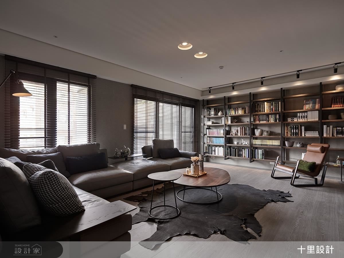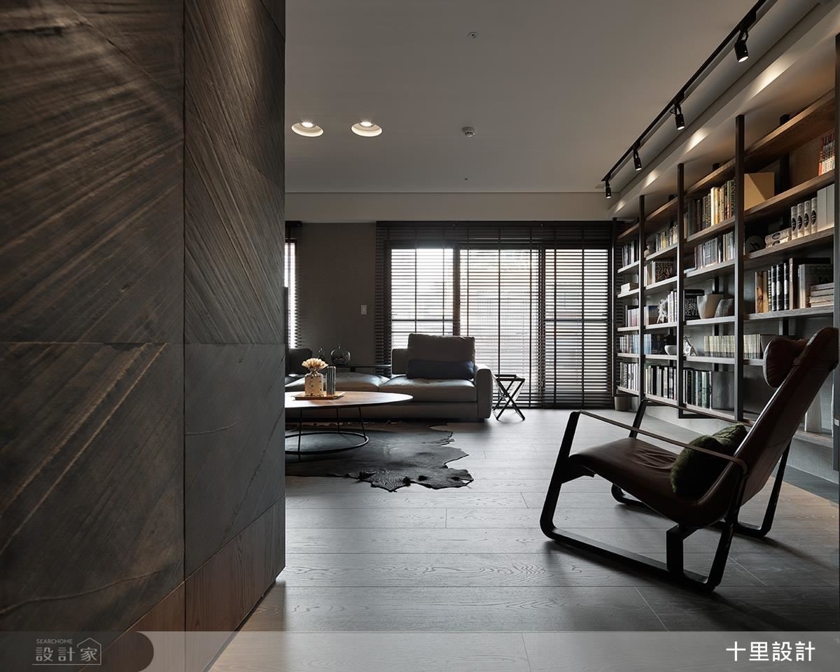 入門右側的大型書牆則是因應屋主的眾多藏書設計,成為家中相當具人文氣息的端景,佐以投射燈與懸空鐵件層架,讓整體視覺更顯輕盈。